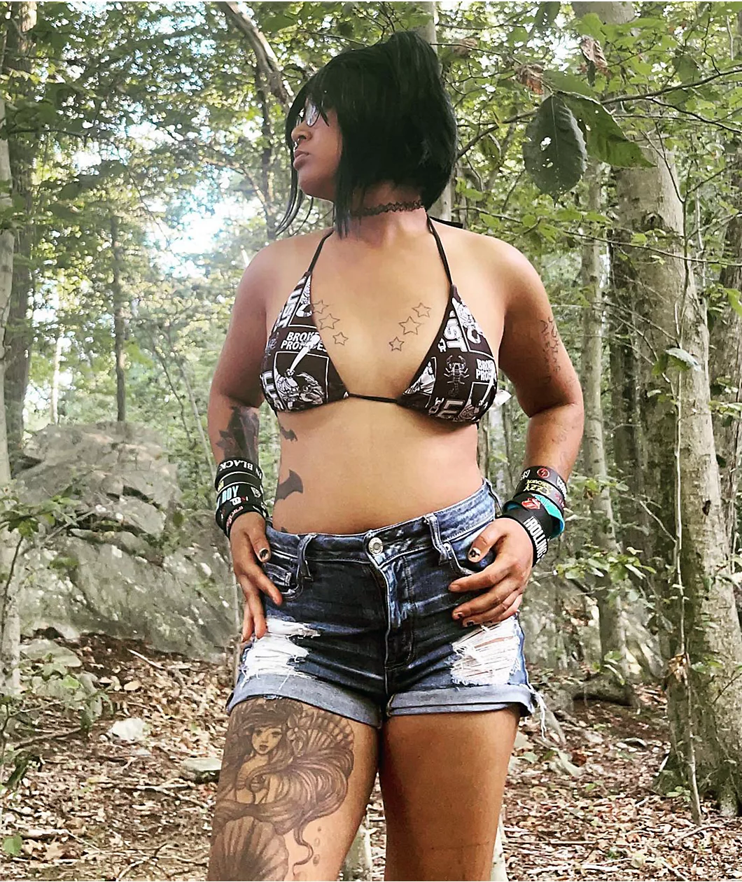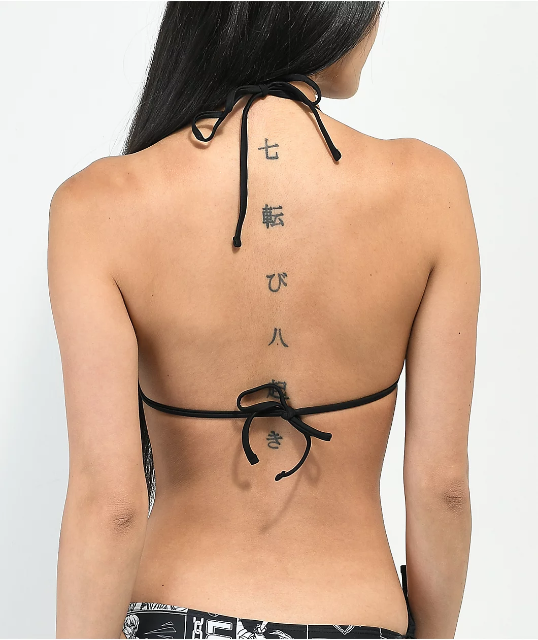 The Arcade Mode Broken Promises bikini top comes in a black colorway with white sublimated graphics of anime-style girls and script in both English and Japanese. This bikini top has a classic triangle cup style with straps to tie around the back and the neck for the perfect fit every time.