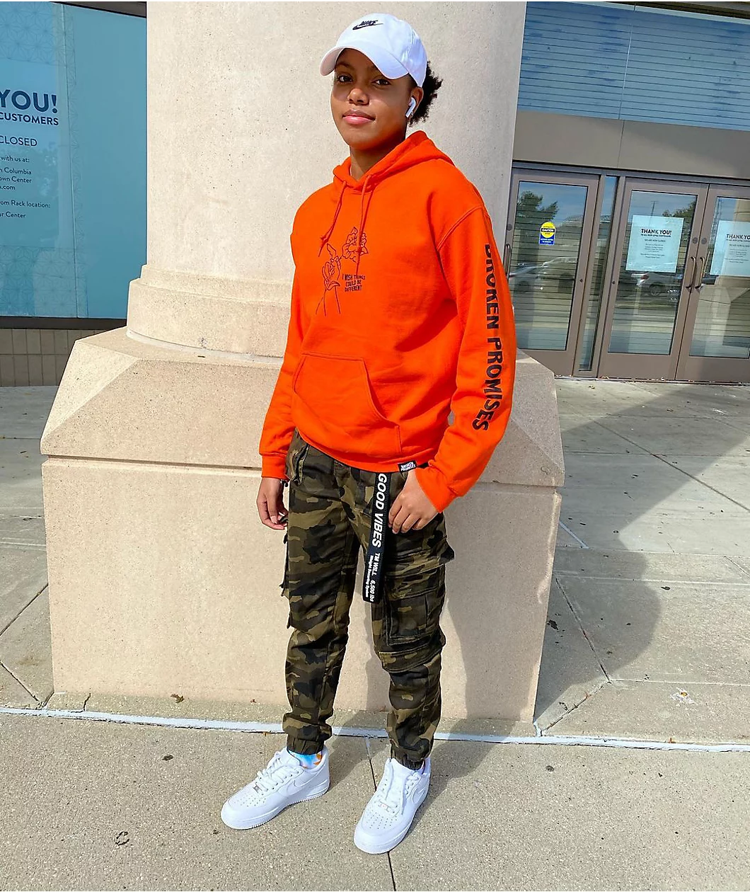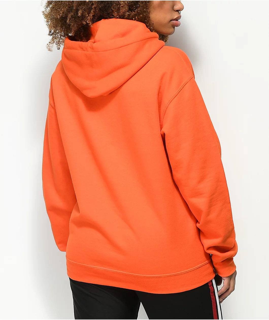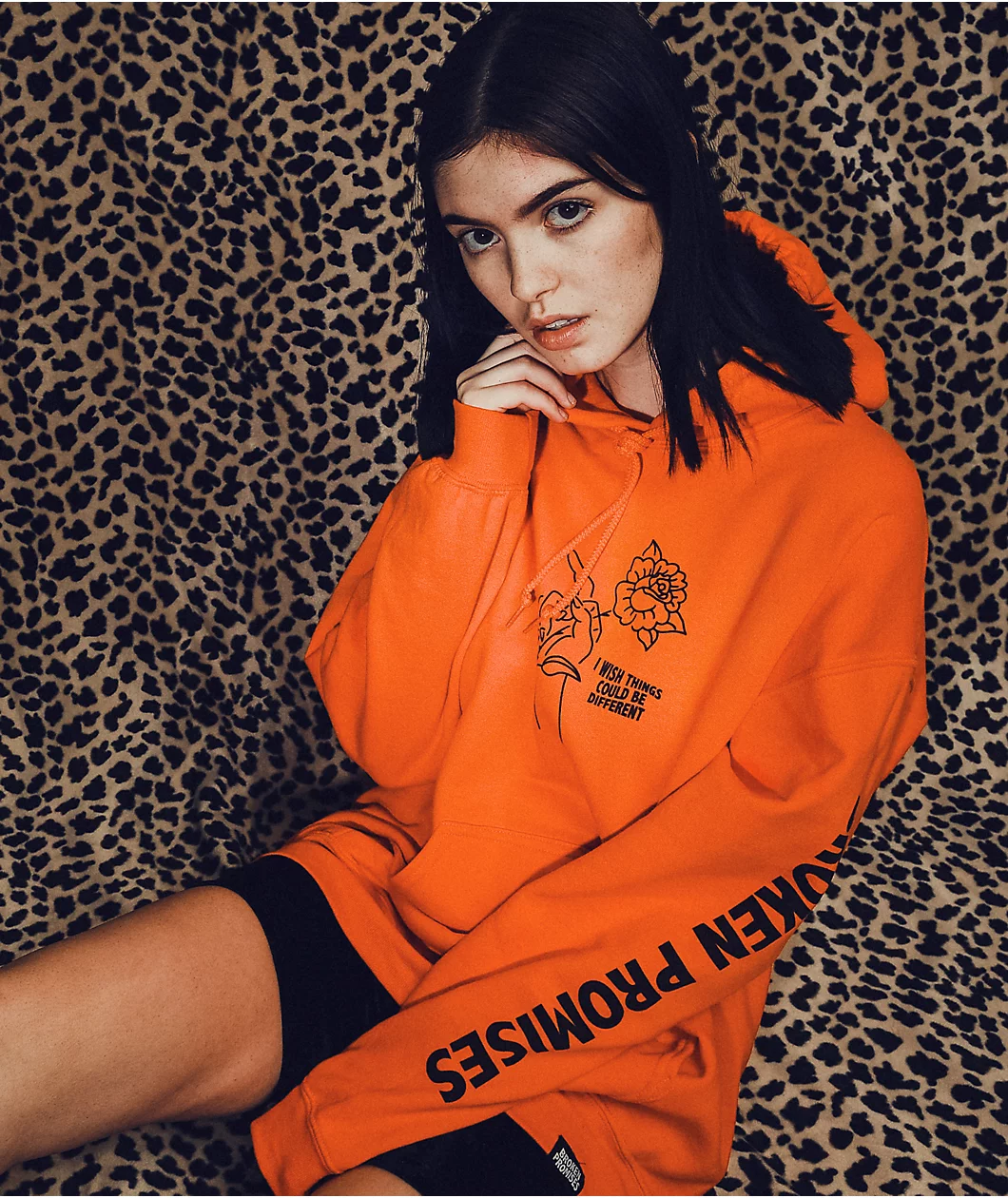 The Could Be Different hoodie from Broken Promises comes in a bright orange colorway with a cotton-poly fabrication and classic pullover construction with a drawstring-adjustable hood and kangaroo pouch pocket. This sweatshirt features a black screen printed graphic of a hand simultaneously holding a single rose while flipping the bird alongside “I wish things could be different” text to the left as well as bold “Broken Promises” text running down the left arm for a finishing touch.