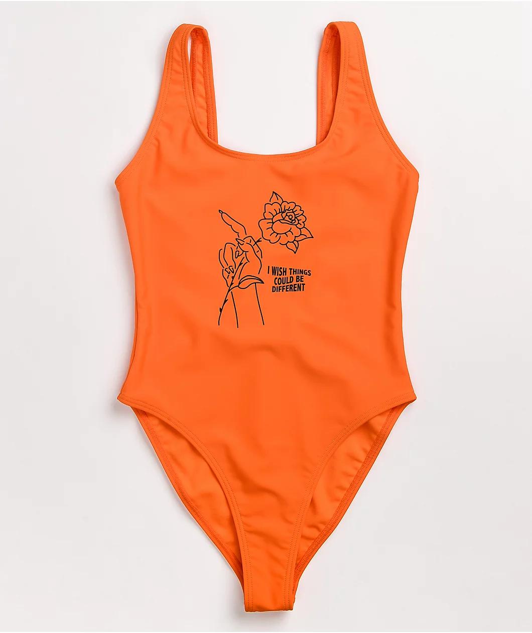 Lounge by the pool in lachrymose style with the Could Be Different orange one piece swimsuit from Broken Promises! This swimsuit’s thick straps and interior lining add extra security functional style, and screen-printed graphics of a hand raising its middle finger and grasping a rose at the chest accompanied by text reading “I Wish Things Could Be Different” at the front imbue the suit with some extra wistful warm-weather style.