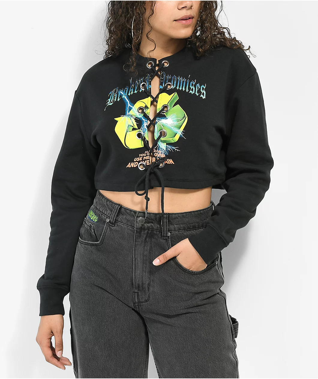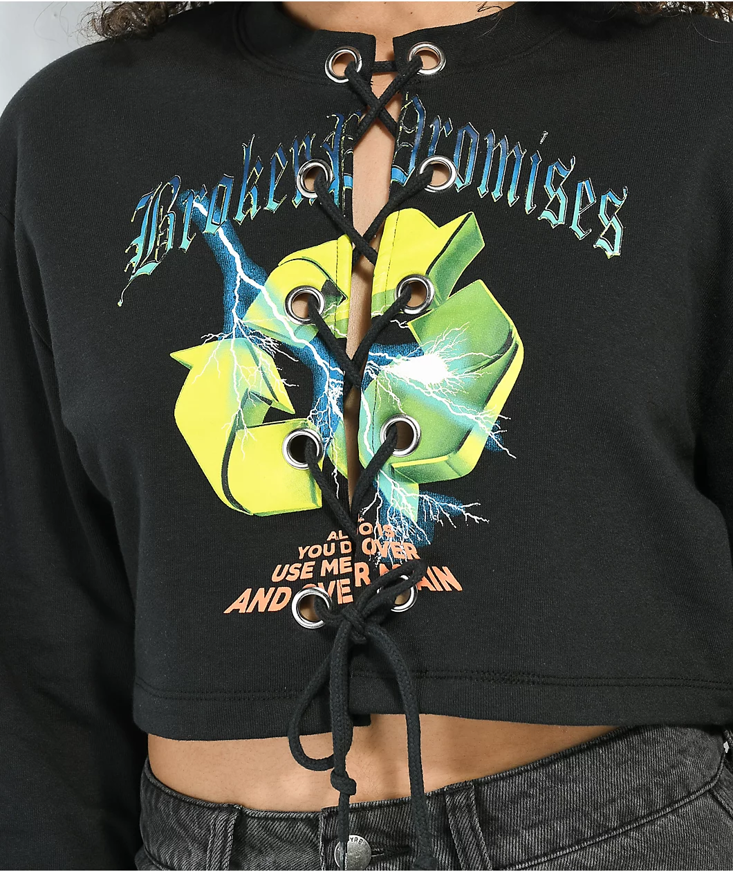 With a unique cropped lace front construction, the Garbage crewneck sweatshirt by Broken Promises features a screen-printed graphic of a recycling symbol, with orange script reading “All you do is use me over and over again” below. The boxy silhouette is complimented by a lace accent on front, and is finished with a brushed interior, metallic accents, and ribbed hems along the cuffs and collar.