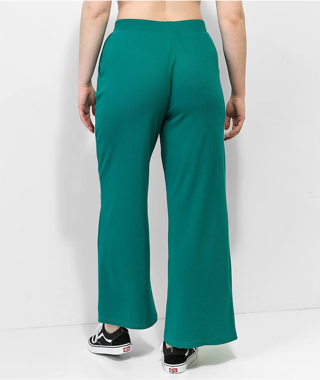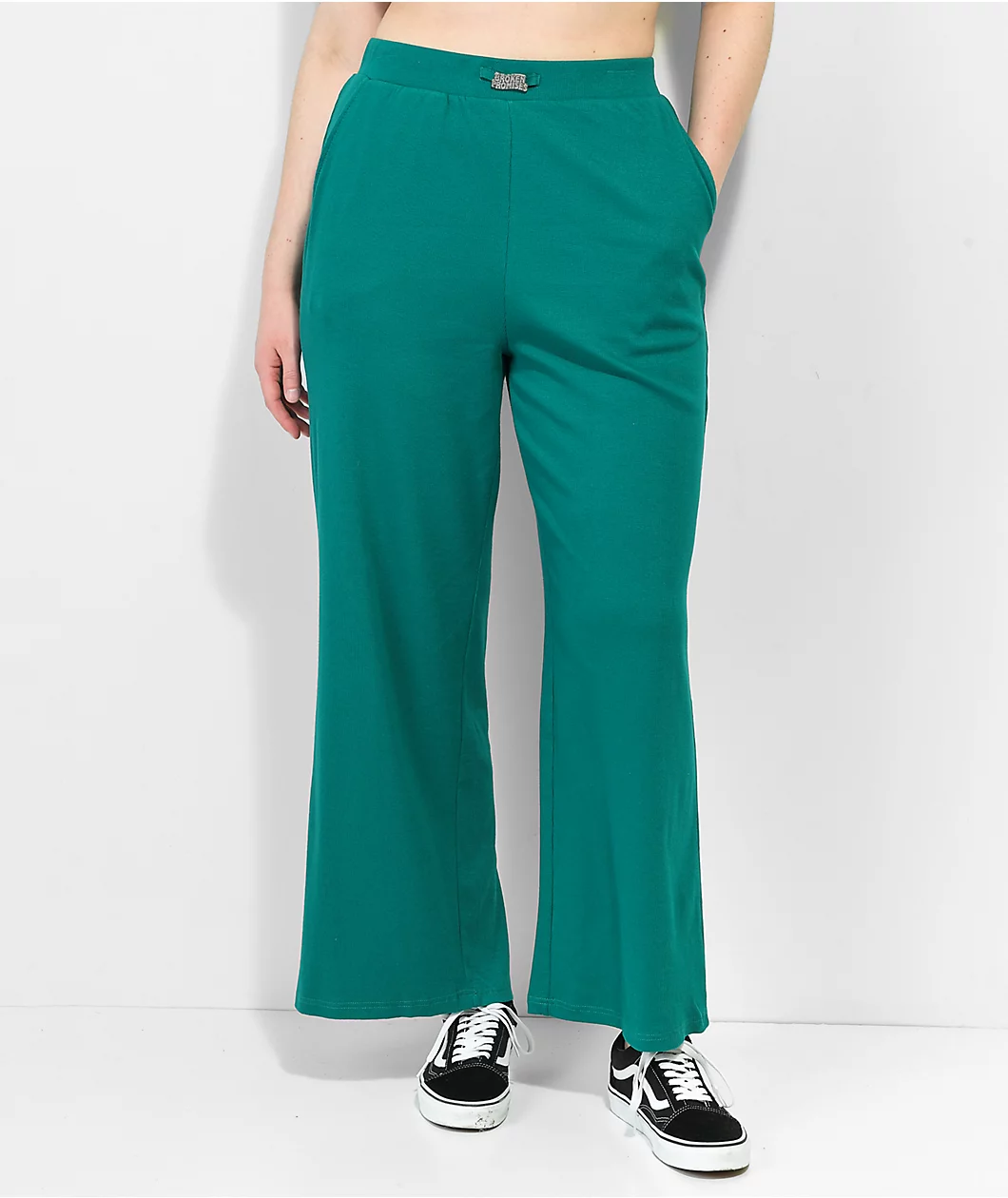 The Salvage Broken Promises pants feature a ribbed, loose fit with a teal colorway as well as a metal charm adorning the front of the elastic waistband.
