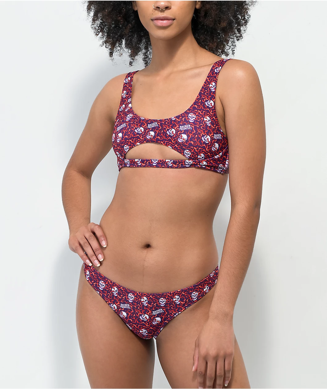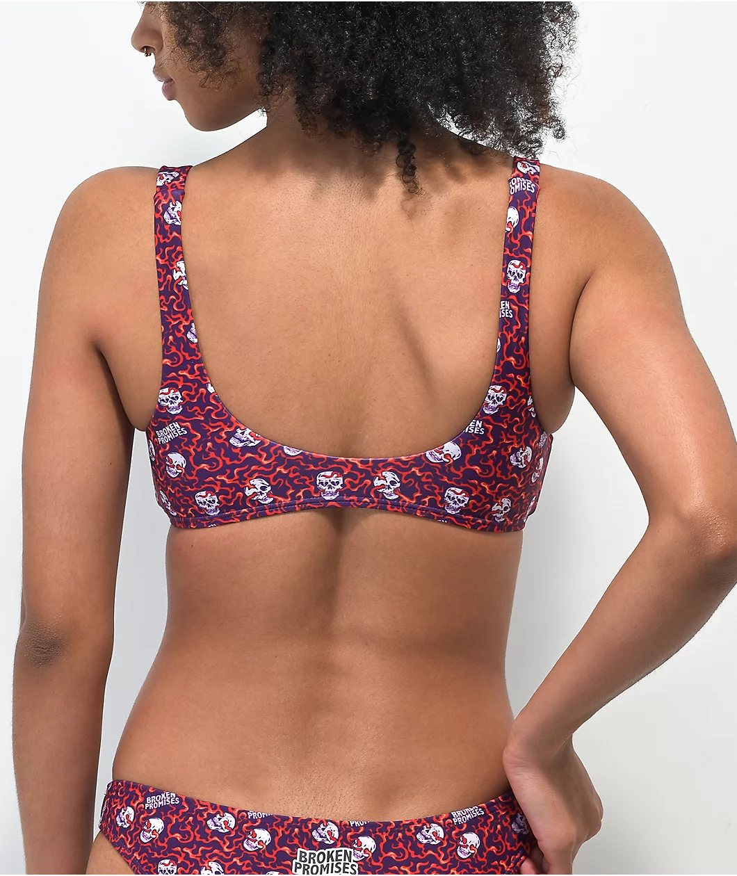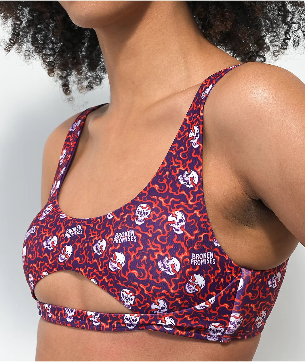 The Trouble In Paradise cutout bikini top from Broken Promises features a unique and eye-catching design with a cutout silhouette below the cups. Decorating the purple top are sublimated graphics of flames and skulls throughout.