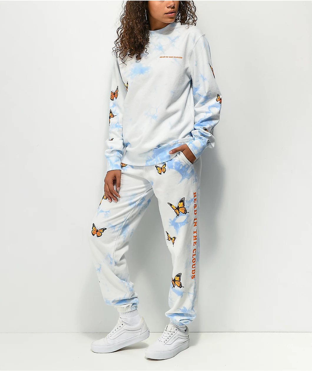 The By Samii Ryan Head In The Clouds blue tie dye sweatpants have screen-printed butterfly graphics throughout the front of the legs, and “Head in the clouds” text down the left leg. These Samii Ryan sweats have a relaxed fit, tapering at the ankle, with a mid-rise, elastic waist, as well as two onseam hand pockets.