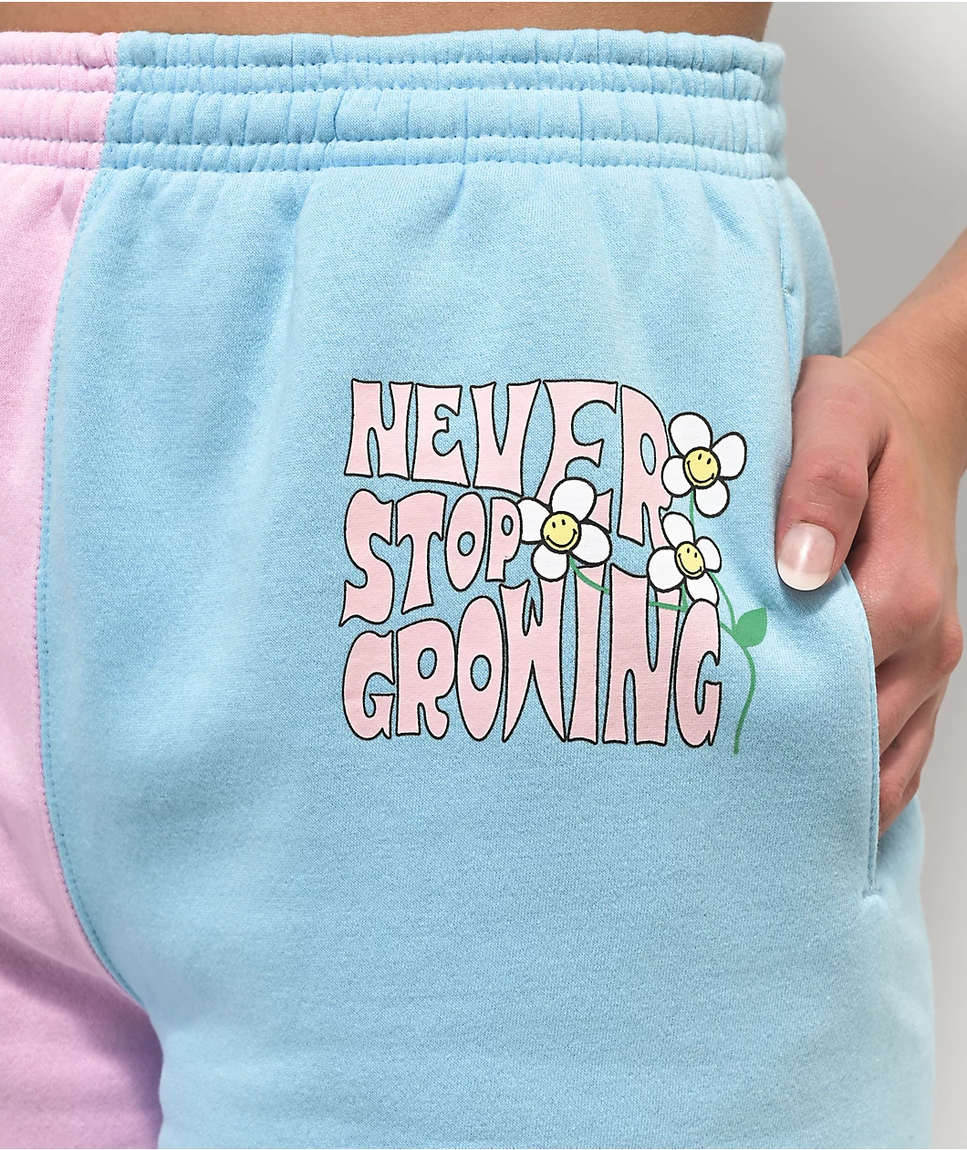 The Smiley Never Stop sweat shorts from By Samii Ryan have a unique split design, with the right leg in baby blue, and the left in pastel pink. These sweat shorts are made from moisture-wicking fabrics to keep you cool and dry, and have a high-rise fit, giving you a flattering look and unrestricted movement. They are finished off with screen-prints on both hips, like flowers on the right leg, and “Never stop growing” on the left.