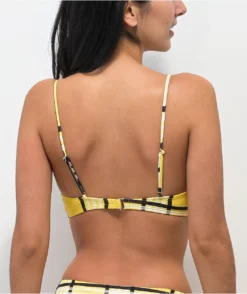 Damsel’s flat ribbed bikini top comes in a chestnut-brown colorway and triangle cup shape for a classic look. Not only is the interior fully-lined, but the padding is totally removable, too. The spaghetti-style straps provide plenty of adjustability, while the cup shape offers moderate coverage and just the right amount of support.