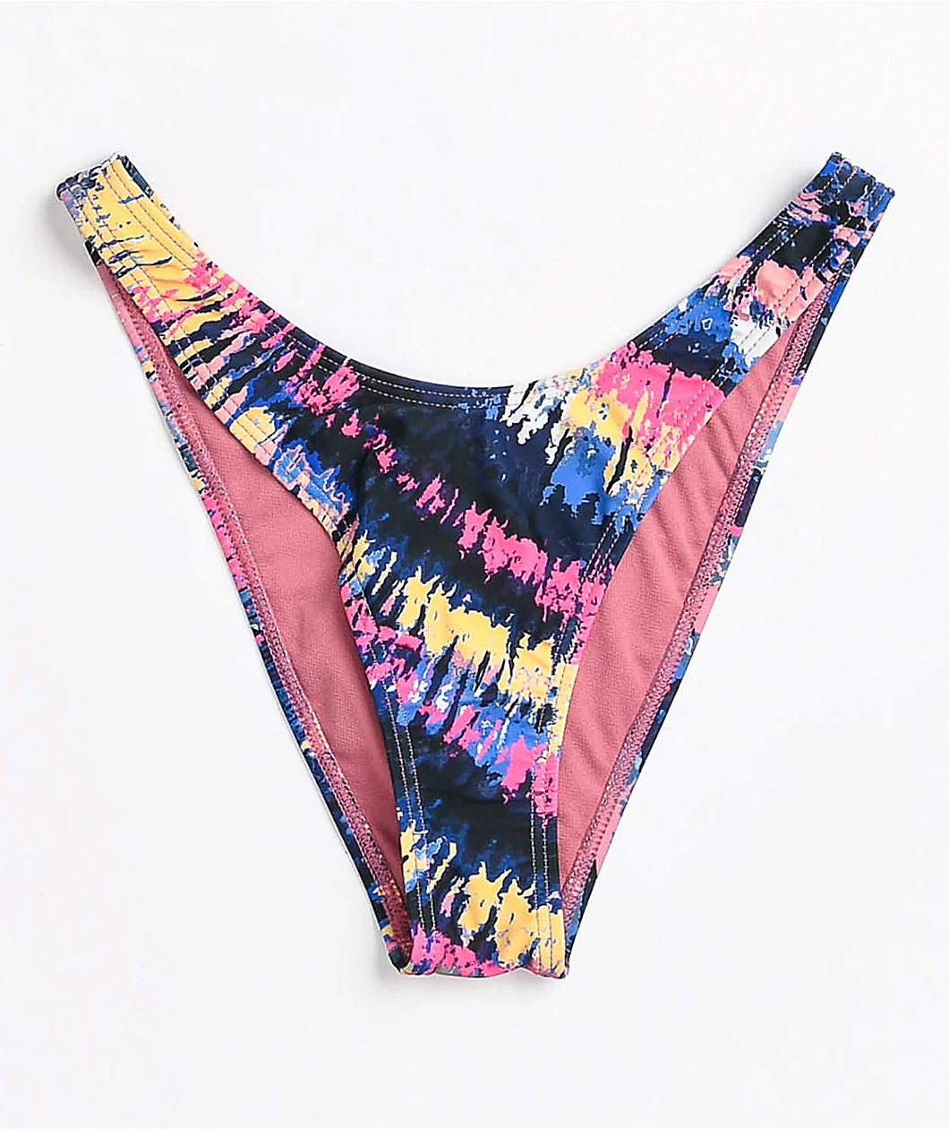 Don’t be afraid to bare a little leg when the weather heats up with Damsel’s Jas multi tie dye high leg bikini bottom! The pastel tie-dye colorway adds some vibrant style to the swimsuit, while the cheeky high-leg silhouette lends the look some daring detail while still providing a moderate amount of coverage where it counts.