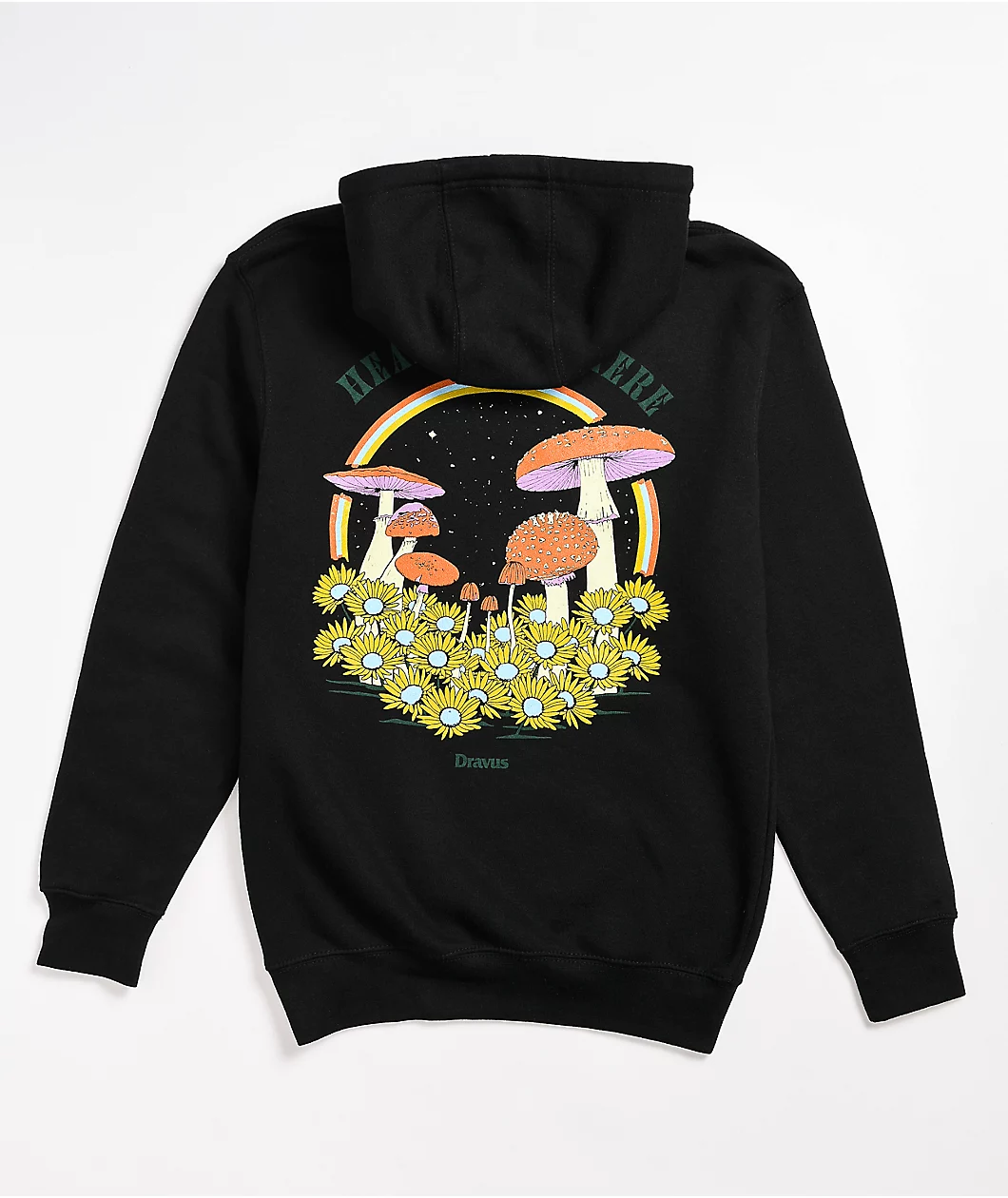 The Rainbow Portal black hoodie from Dravus features a screen-printed graphic of mushrooms, flowers, and stars on the back encircled by a rainbow for an otherworldly touch of splendor. The soft construct is made of a cotton-poly blend and comes with an adjustable hood making this hoodie the coziest option to throw on whether you’re out adventuring or staying in.