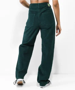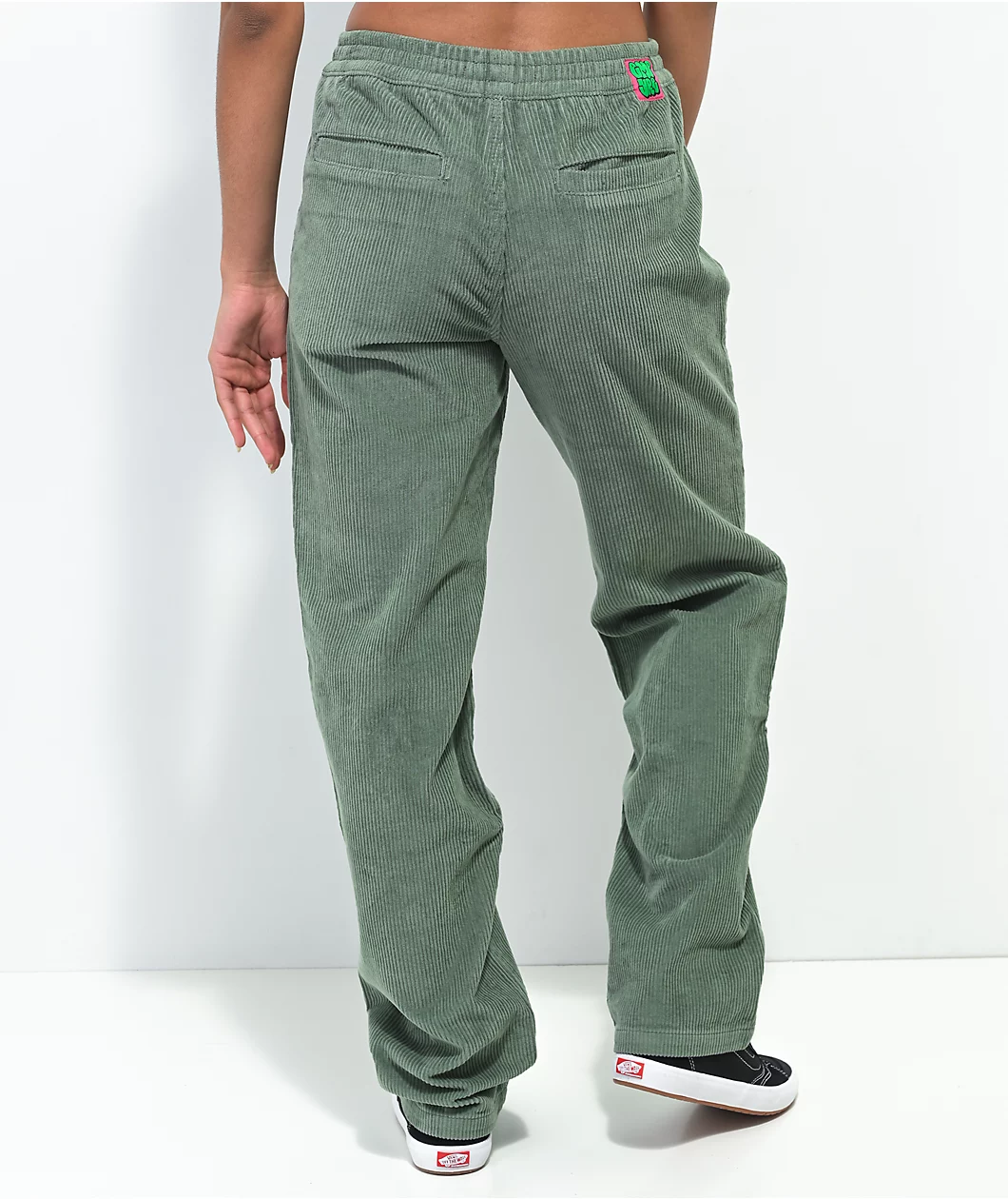 The Jessie corduroy skate pants from Empyre come in a striking sage green colorway and loose, straight leg silhouette, with an elastic waist. They have a comfortable, durable corduroy construction, along with two front slash pockets and seat pockets, and a adjustable drawstring waistband eliminating the need for a belt.