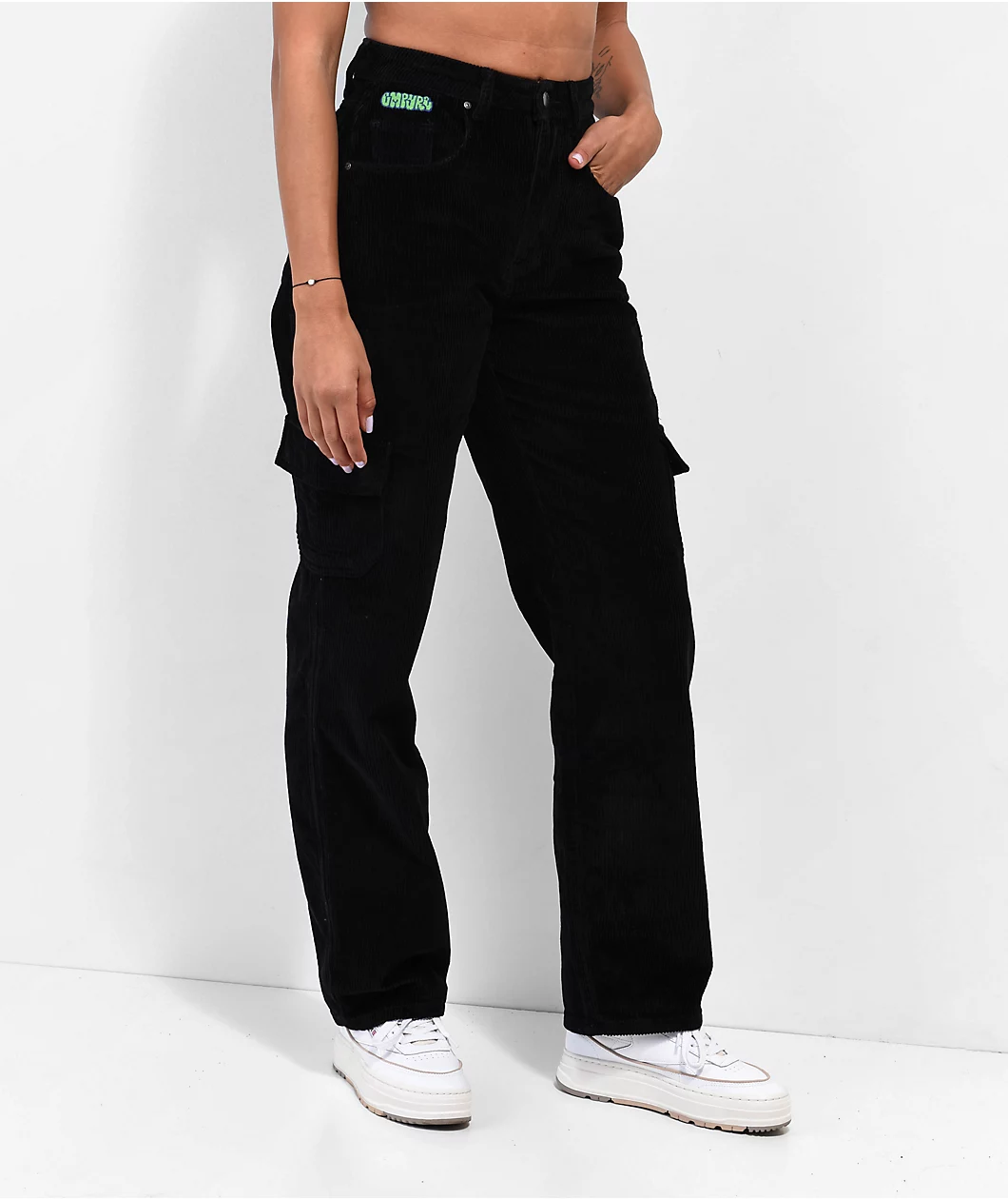 The Tori cargo skate pants from Empyre are made of 100% cotton and come in a black corduroy construction with a standard five pocket construction and cargo pockets at each thigh. These stylish skate pants feature a loose fit, adorned by an embroidered Empyre logo graphic on the front right and back right pockets. The button-and-zip closure fastens the waistband for a high waisted look while the belt loops along the side invite accessories and extra security.