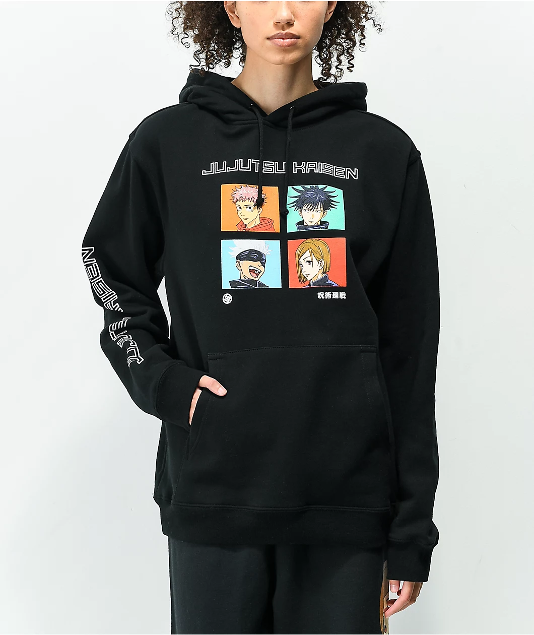 The Episode x Jujutsu Kaisen’s Squad black hoodie features a soft, brushed interior made of a cotton-poly blend to keep you comfortable and warm. The all-black colorway lends it a minimalist design with screen-printed graphics of the protagonists of Jujutsu Kaisen adorning the sweatshirt’s front so you can keep your favorite jujutsu sorcerers close.