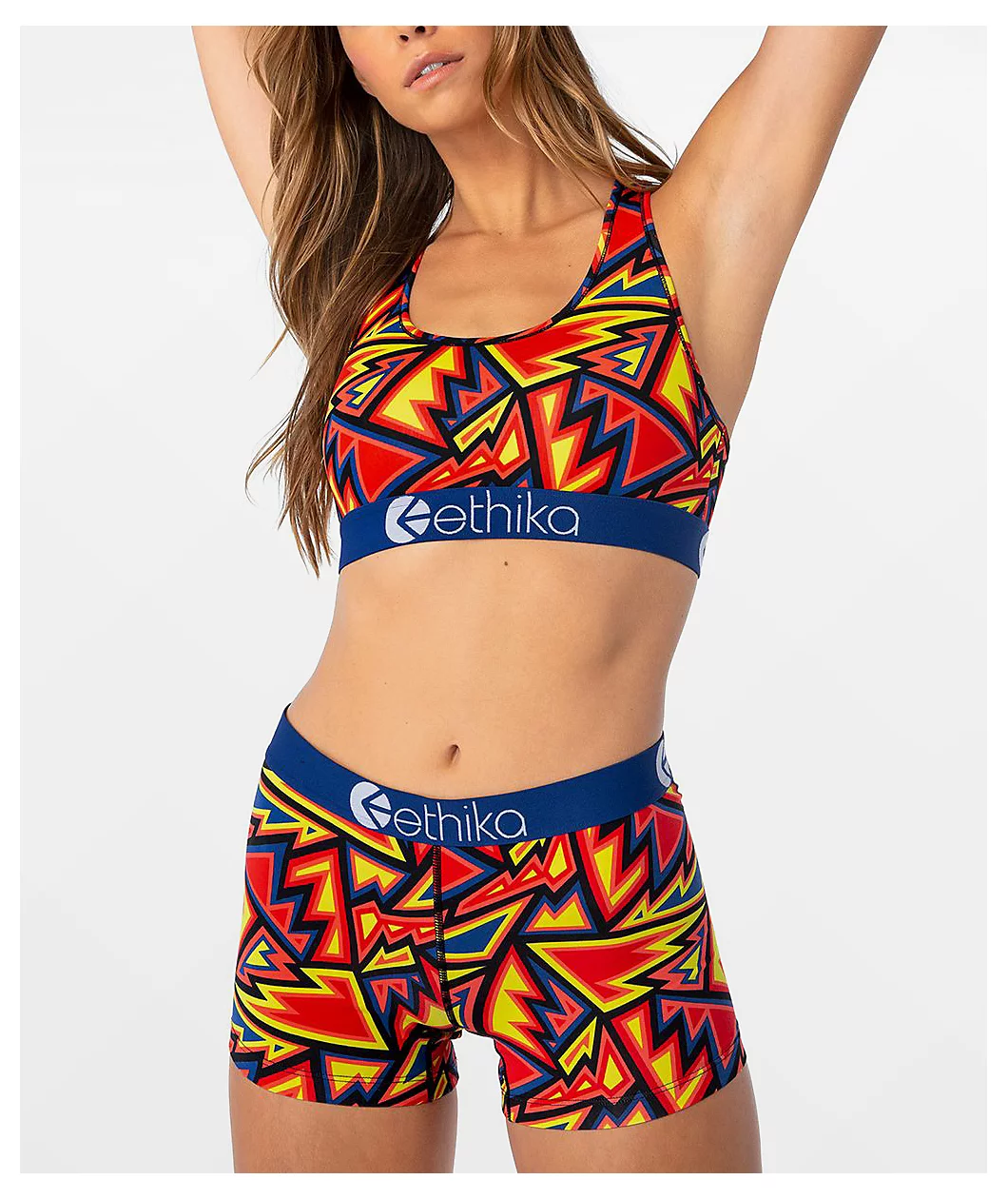 Give your ta-tas a pop of color with the Ethika Abstract Range sports bra. Red, blue and yellow geometric patterns line the entirety for bold and fun vibes, while the dual layer front adds a soft and comfortable fit as well.