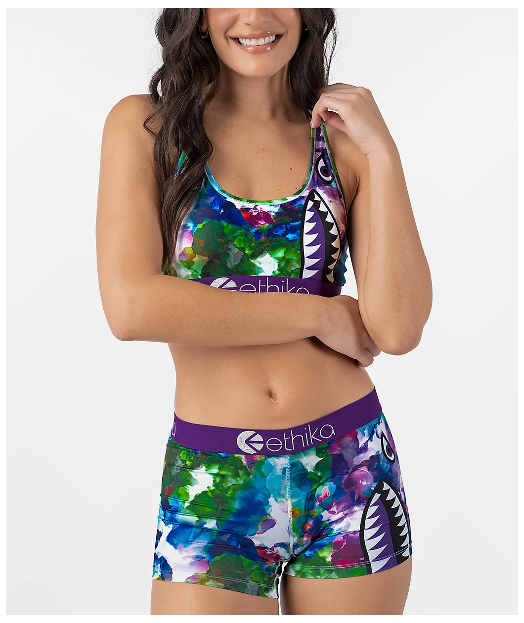 Throw some colour into that underwear collection with the Bomber Marble Petal boyshort underwear from Ethika! Ethika’s classic Bomber Shark graphic appears down the left leg, contrasting beautifully against the blue, green and purple marble petal colorway beneath.