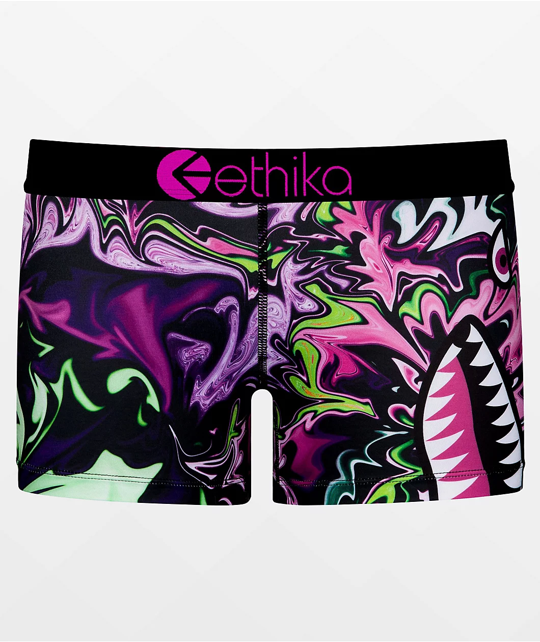 Add some vibrance to your underwear drawer with the Ethika Bomber Planet Dye boyshort underwear! This striking pair of underwear sports a black base color with a white, purple, pink and green “planet dye” marbled throughout for plenty of eye-catching style. Of course, Ethika’s Bomber shark mouth graphic shows up at the left outseam to finish off the appearance in striking style.
