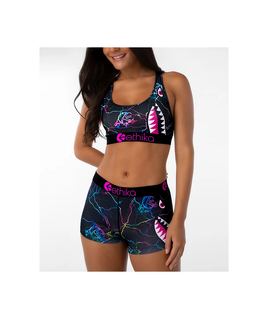 Strike some marvelous style into your underwear drawer with the Bomber Rainbow sports bra from Ethika! This black sports bra features rainbow-colored lightning strikes throughout, with Ethika’s signature bomber logo on the left chest.