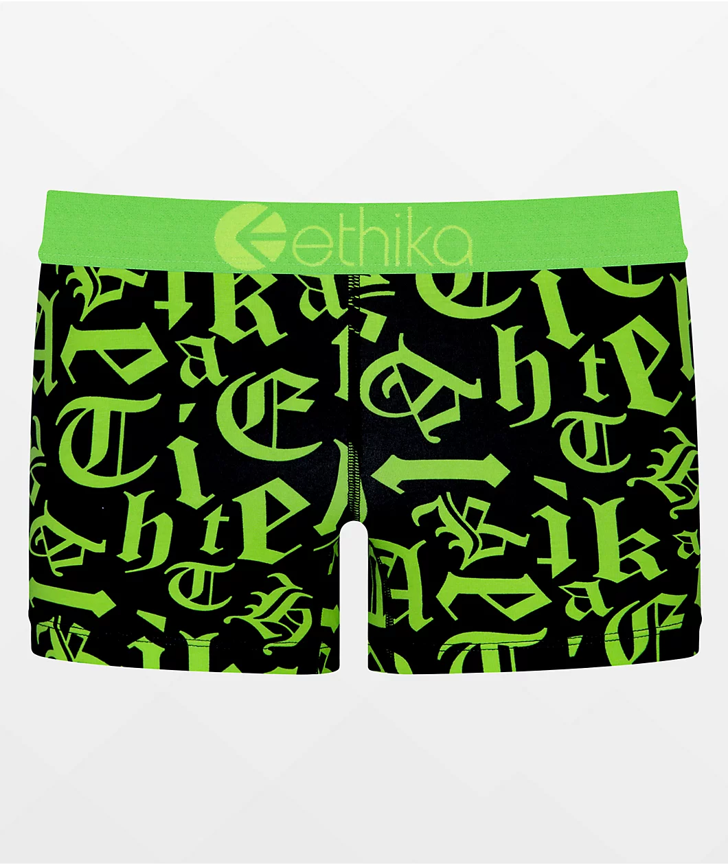 Stay comfortable all day long with the Good Looks staple boyshort underwear from Ethika! These ultra-soft, poly-spandex boyshorts feature lime green letters throughout, and a thick, green elastic waistband for added style and a snug fit.
