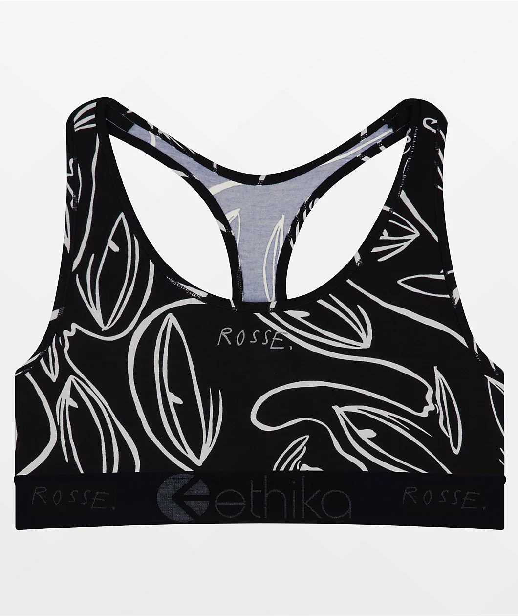 The Rosse Cult Ethika sports bra features a thick, black underbust band with the brand name and “Rosse” printed across it as well as sublimated graphics of drawn eyes and script reading “Rosse” across the chest. This sports bra has a fixed racer back design with a dual layer front panel for coverage and comfort.
