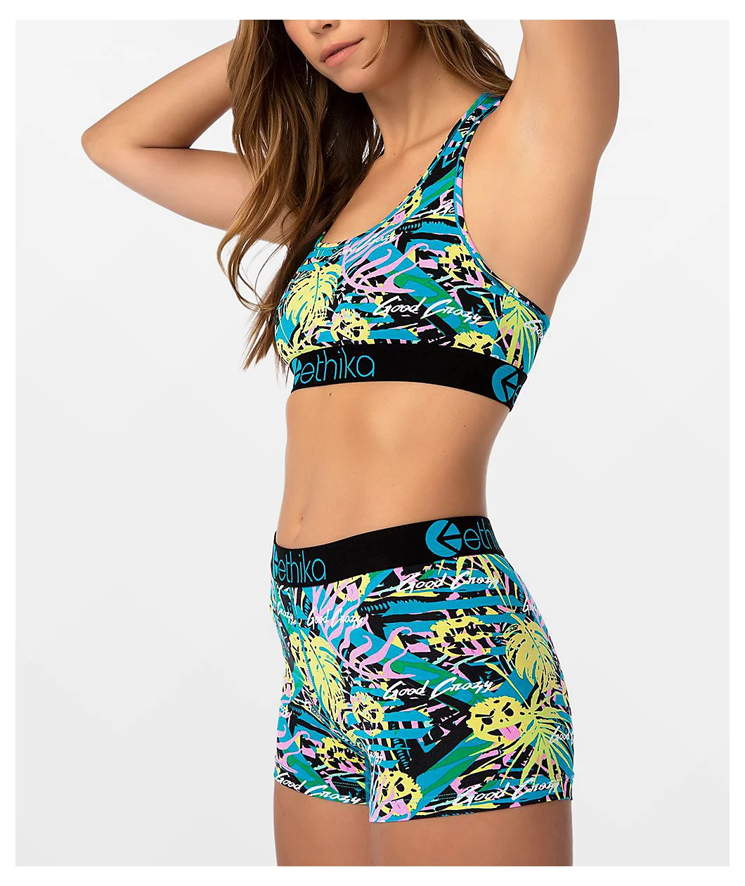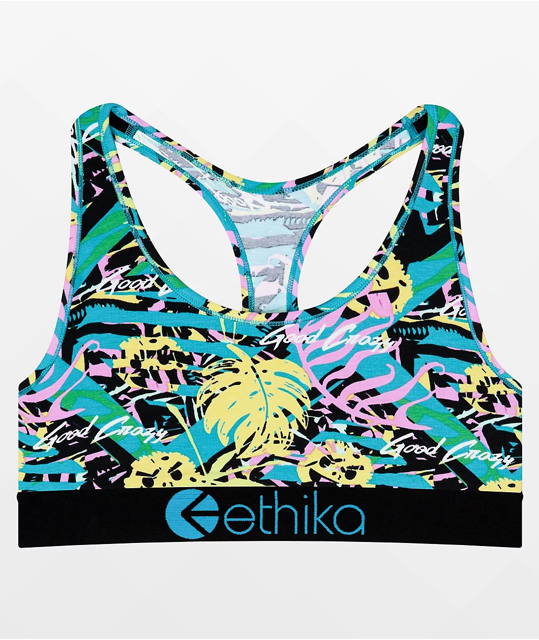 Striking and supportive, the Vida Loca sports bra from Ethika x Dani Alves will add some wild style to any underwear drawer. Sublimated plant graphics in shades of neon yellow, pink, green, black, and blue decorate the bra, highlighted by smiling faces and script reading “Good Crazy”. Racerback-style straps and a wide elastic under-bust band keep the bra supportive, while the stretchy cotton, modal, and spandex construction keeps it stretchy and soft.