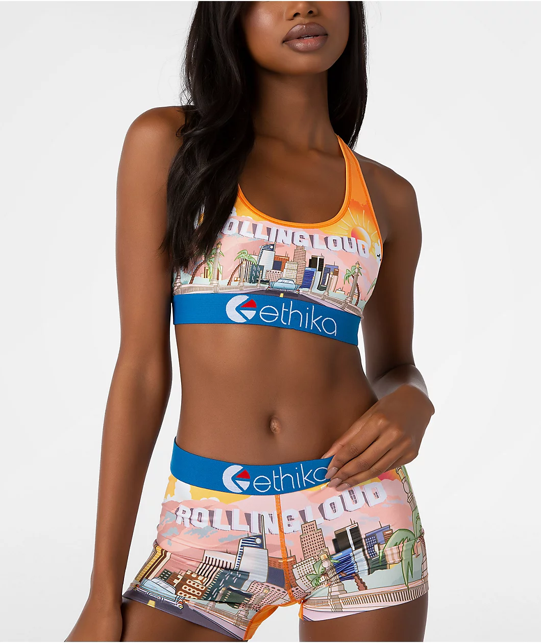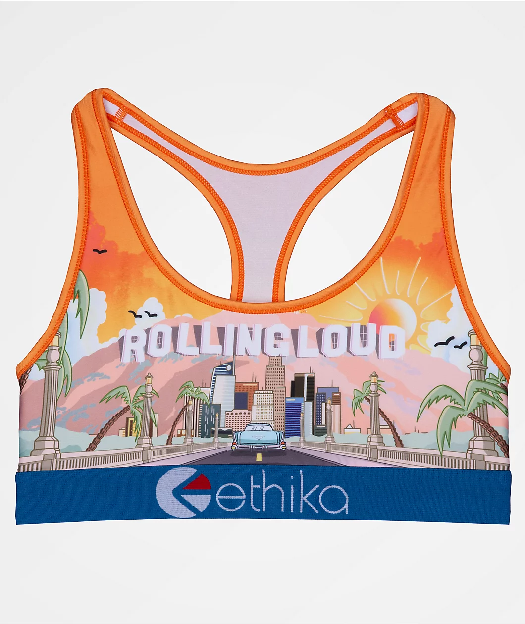 Why not make your unmentionables the entertainment capital of the world with Ethika’s x Rolling Loud LA 2021 sports bra! Thanks to this bra’s stretchy polyester-spandex construction, it hits the trifecta: comfortable, breathable, and form-fitting. On the front is a sublimated graphic depicting a vintage car coasting into downtown Los Angeles as the sun rises, and, replacing the iconic Hollywood sign, is the text “Rolling Loud.”