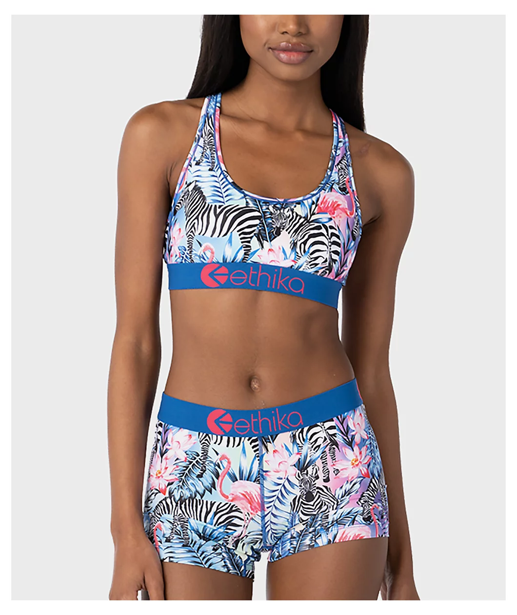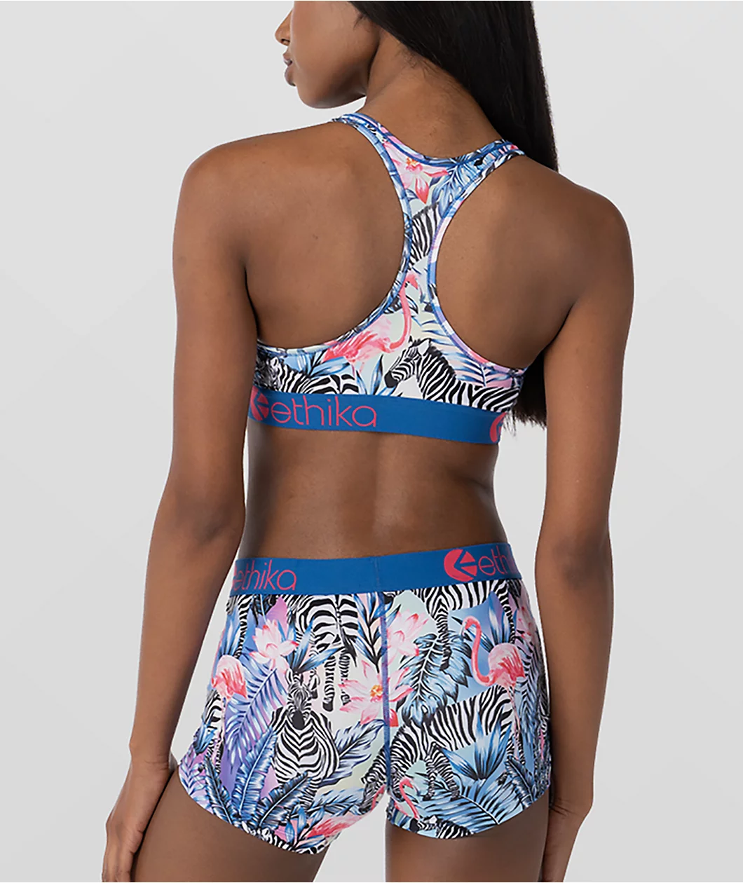 Zebras, flamingos, and lush flowers. Ethika is back at it again with the Zebra Paradise blue boyshort underwear! These underwear come with colorful graphics of Zebras, flamingos, blue foliage, tropical flowers, and a dreamy blue and pink background to complete the look.