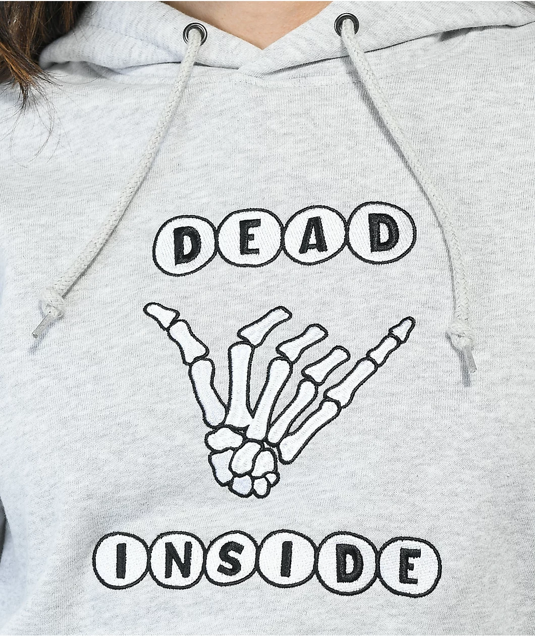 The Dead Inside crop hoodie from JV by Jac Vanek comes in heather grey with an embroidered skeleton hand and “Dead inside” text on the chest. This Jac Vanek hoodie has a slim, cropped silhouette, cutting at the midriff for a flattering look. Made from a super soft, lightweight cotton-poly blend, this hooded pullover will keep you comfy any time, any where.