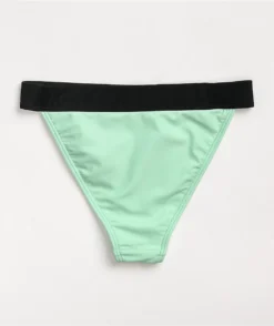 The Stop Trippin bikini bottom from JV by Jac Vanek features a high leg silhouette that comes in a pastel pink colorway, and features screen-printed script throughout that reads “stop trippin.”