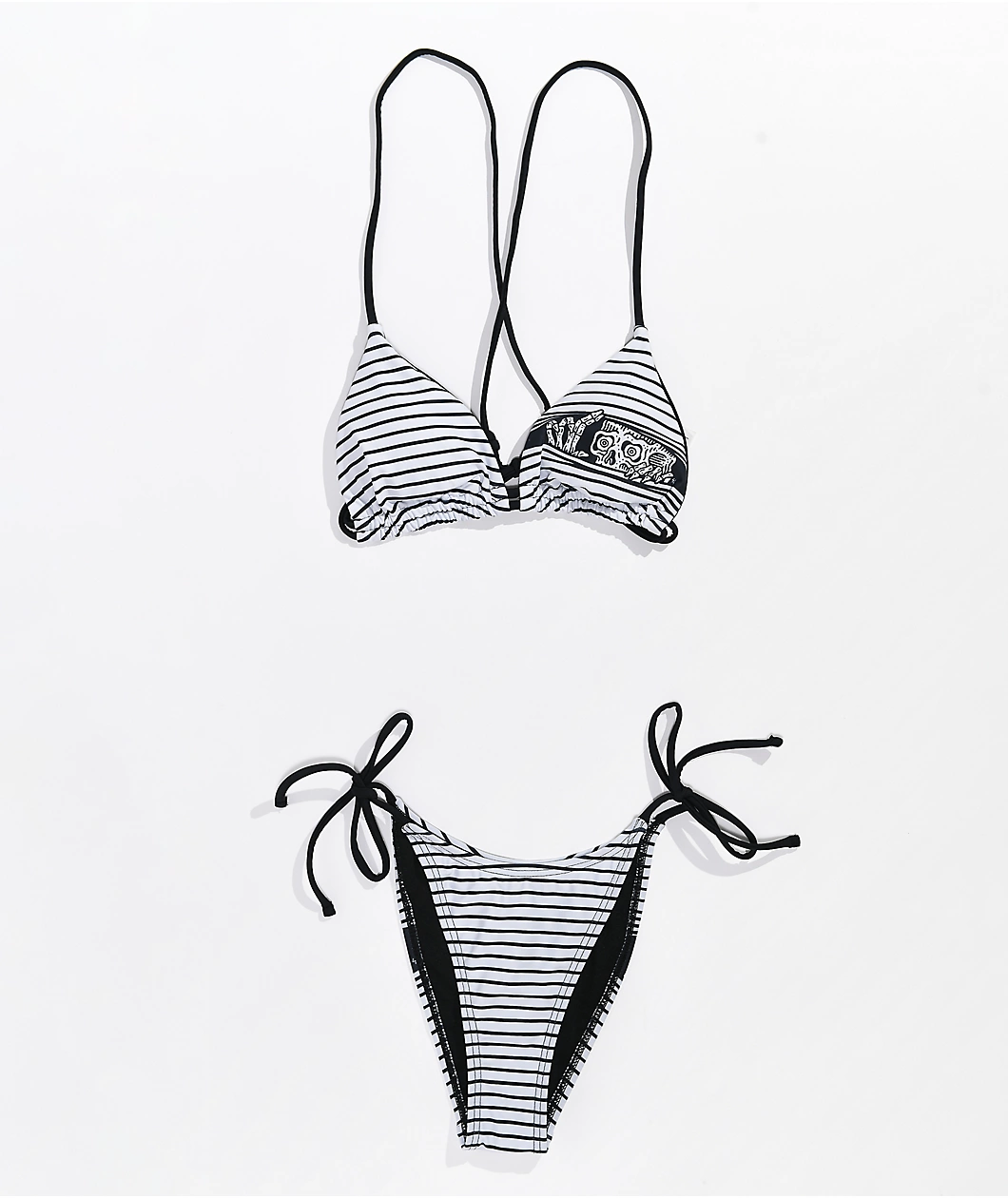 The Peeking bikini bottoms from Lurking Class by Sketchy Tank have a high leg cut with tie-strings at the hips. They have a horizontal, black and white stripe design, with Lurker peeking through the stripes like blinds. These bathing suit bottoms are fully-lined and made from quick-drying polyester, so you can go from the water to lounging without losing any comfort.