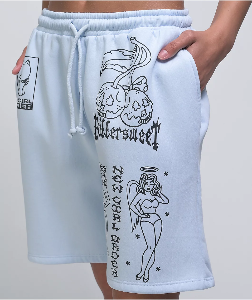Pick up some pastel panache with the Devil Angel light blue sweat shorts from NGOrder. An angel-woman and devil-woman both appear at the left leg opening, with NGOrder text separating them, while the skull-cherry graphics at the left leg feature “Bittersweet” written underneath to finish off the dichotomous look of these comfy sweat shorts.