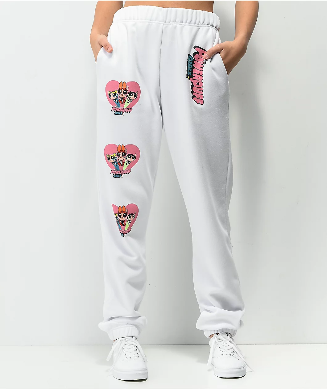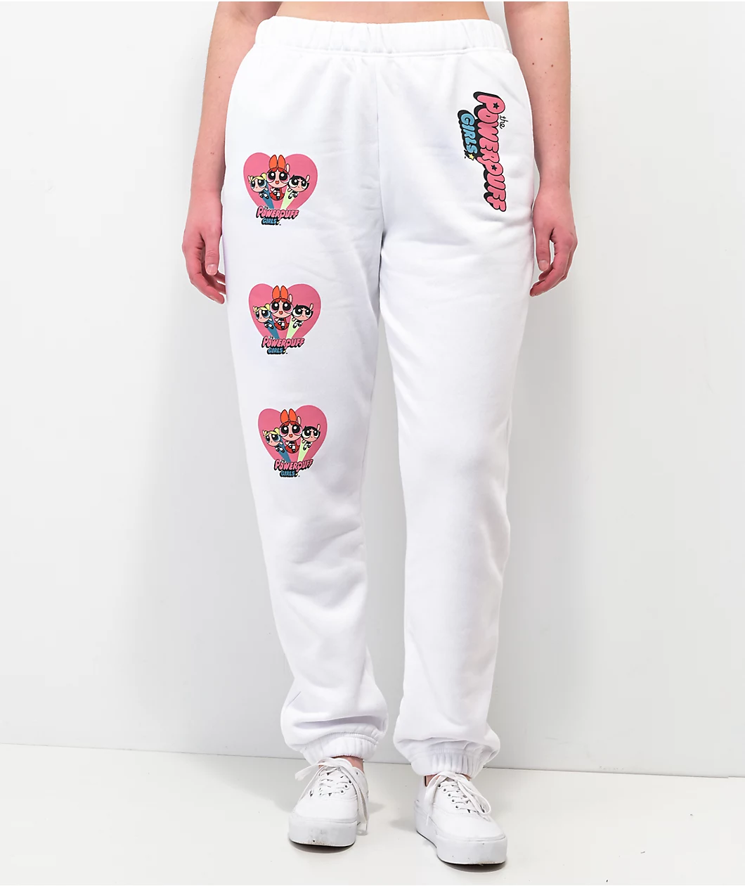 Whether you’re lounging around or out on the town, the NGOrder x Powerpuff Girls white jogger sweatpants are the perfect answer. These super-soft, super-cozy sweats have a jogger fit and an all-white colorway. Each hip has screen-printed imagery, like the puffy Powerpuff Girls script on the left, while the right bears the trio flying off into action.
