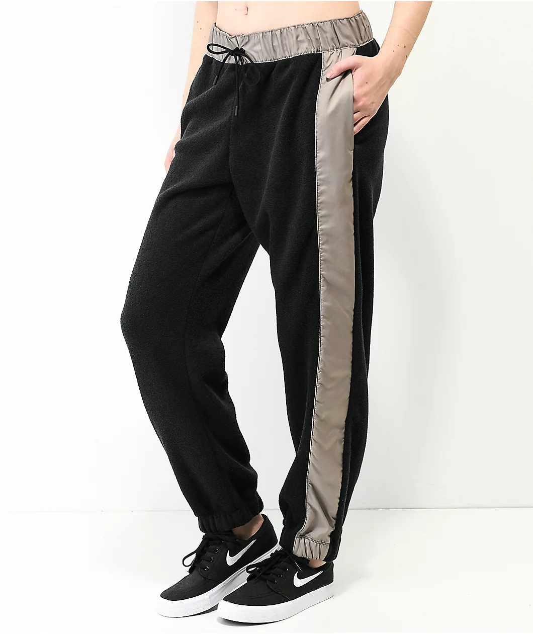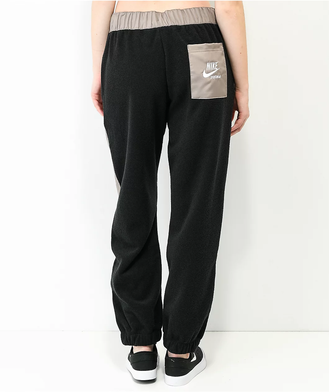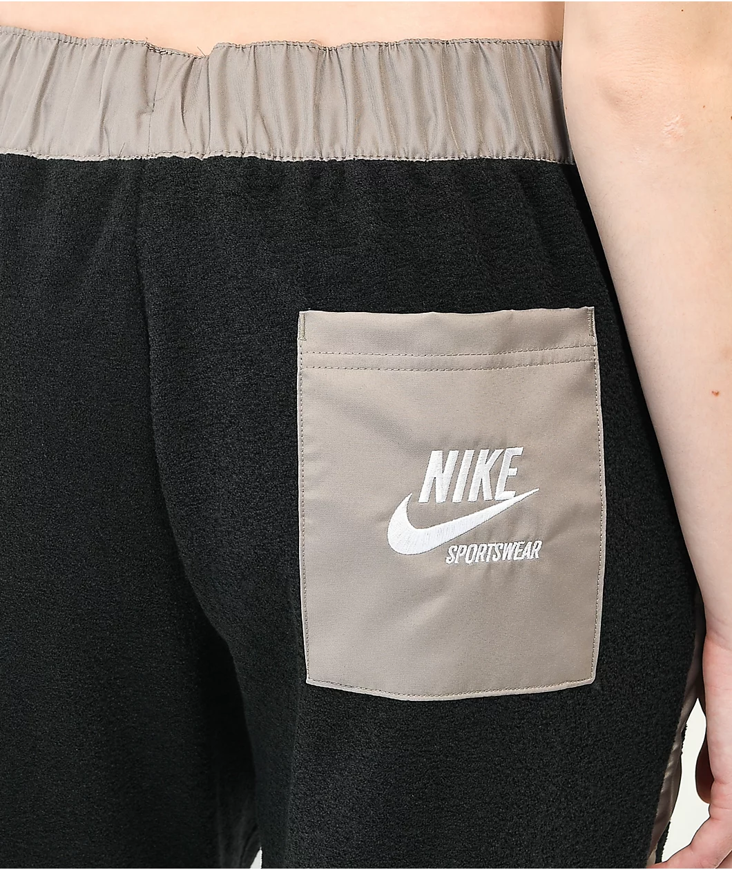 The Nike Sportswear Essential black and grey fleece sweatpants feature a unique silhouette with a soft black fleece construction, and grey polyester paneling along the sides of the legs and drawstring-adjustable waistband. The sweatpants also feature elastic ankle cuffs for a snug fit, and a light brown backseat pocket with an embroidered Nike Sportswear logo, providing comfort and athletic branded style to your daily outfits.