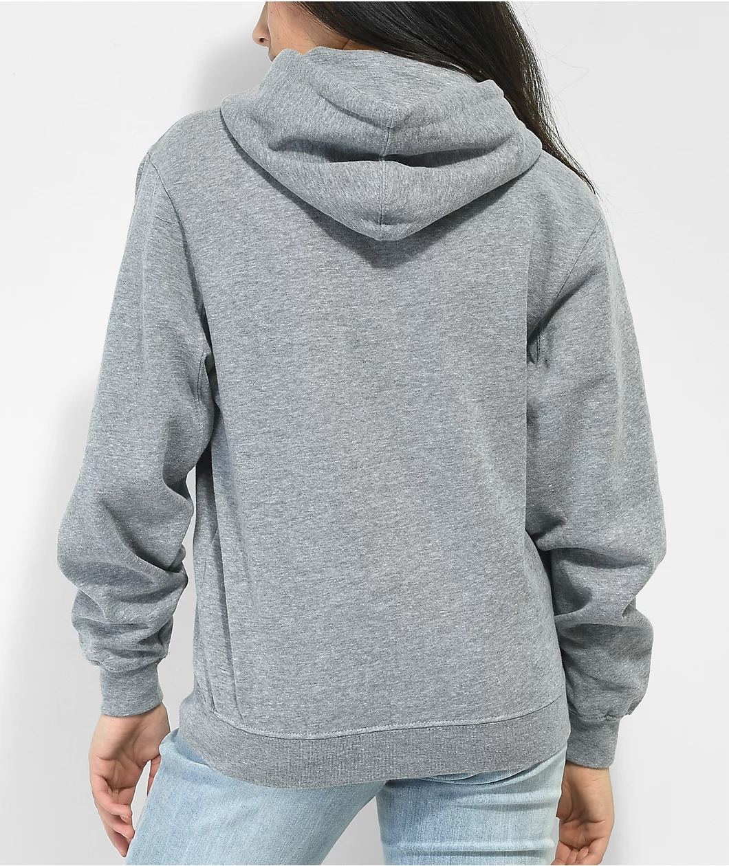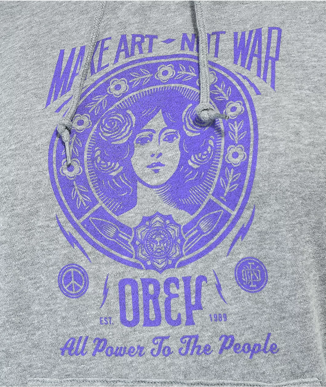 Super soft and lightweight, the Make Art Not War hoodie from Obey is made from a premium cotton-poly blend, and has a classic fit accompanied by the classic adjustable hood and kangaroo pouch pocket. This Obey hoodie has a heather grey colorway with a screen-printed purple graphic on the chest of a woman bordered by a floral pattern, and “Make art not war | All power to the people” text.