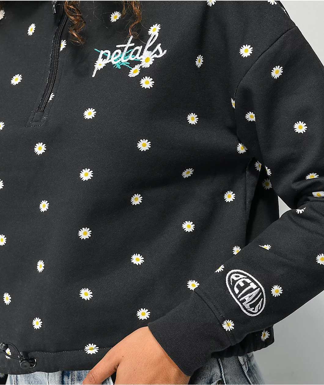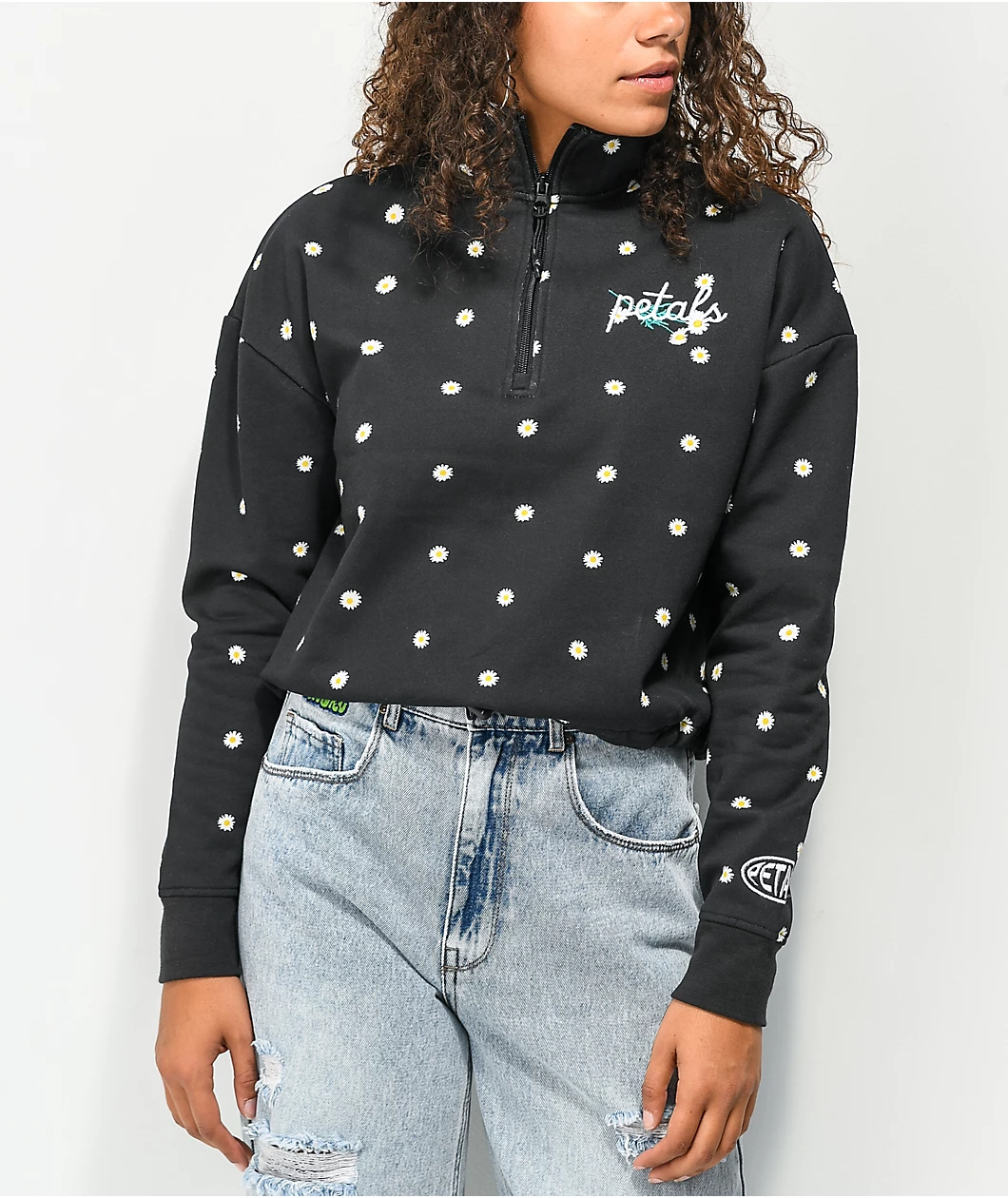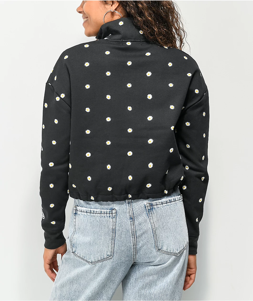 Lend some warm, floral flair to your cool-weather clothing collection with the Daisy Garden black quarter zip sweatshirt from Petals by Petals and Peacocks! This sweatshirt features fleece-lined interiors and a high-rising mockneck collar, perfect for keeping cozy whilst you lounge, while the cropped hemline and quarter-zip collar adds a little interest to the silhouette. Sublimated daisy graphics decorate the sweatshirt, lending it a dash of pretty, petaled steez.