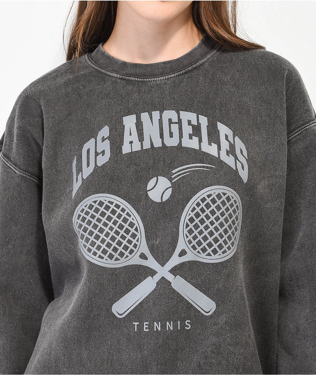 In a black wash colorway comes the LA Tennis crewneck sweatshirt from Philcos, showing off the image of two tennis racquets on the chest with script above and below that reads “Los Angeles | Tennis”. This crewneck is made from a durable yet soft cotton-poly blend, offering a classic look with a ribbed collar, sleeve cuffs and bottom hemline.