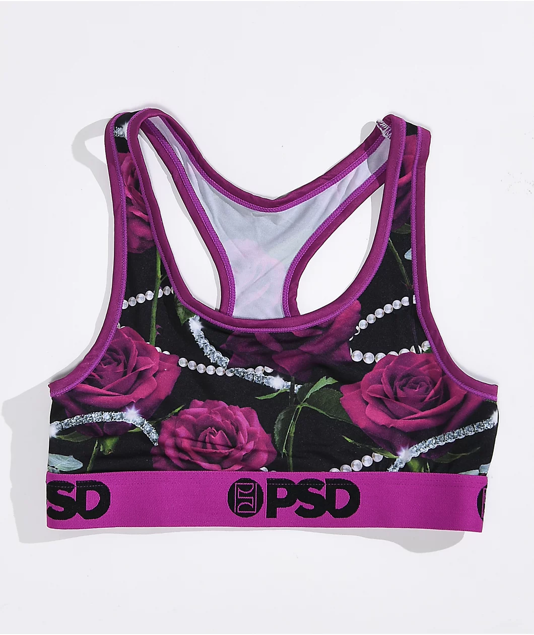 The Diamonds And Pearls PSD sports bra comes in a magenta colorway with a sublimated graphic throughout depicting strings of pearls and diamonds laid over magenta roses. This sports bra features many attributes for added comfort and breathability including perforated mesh lining and moisture-wicking material.