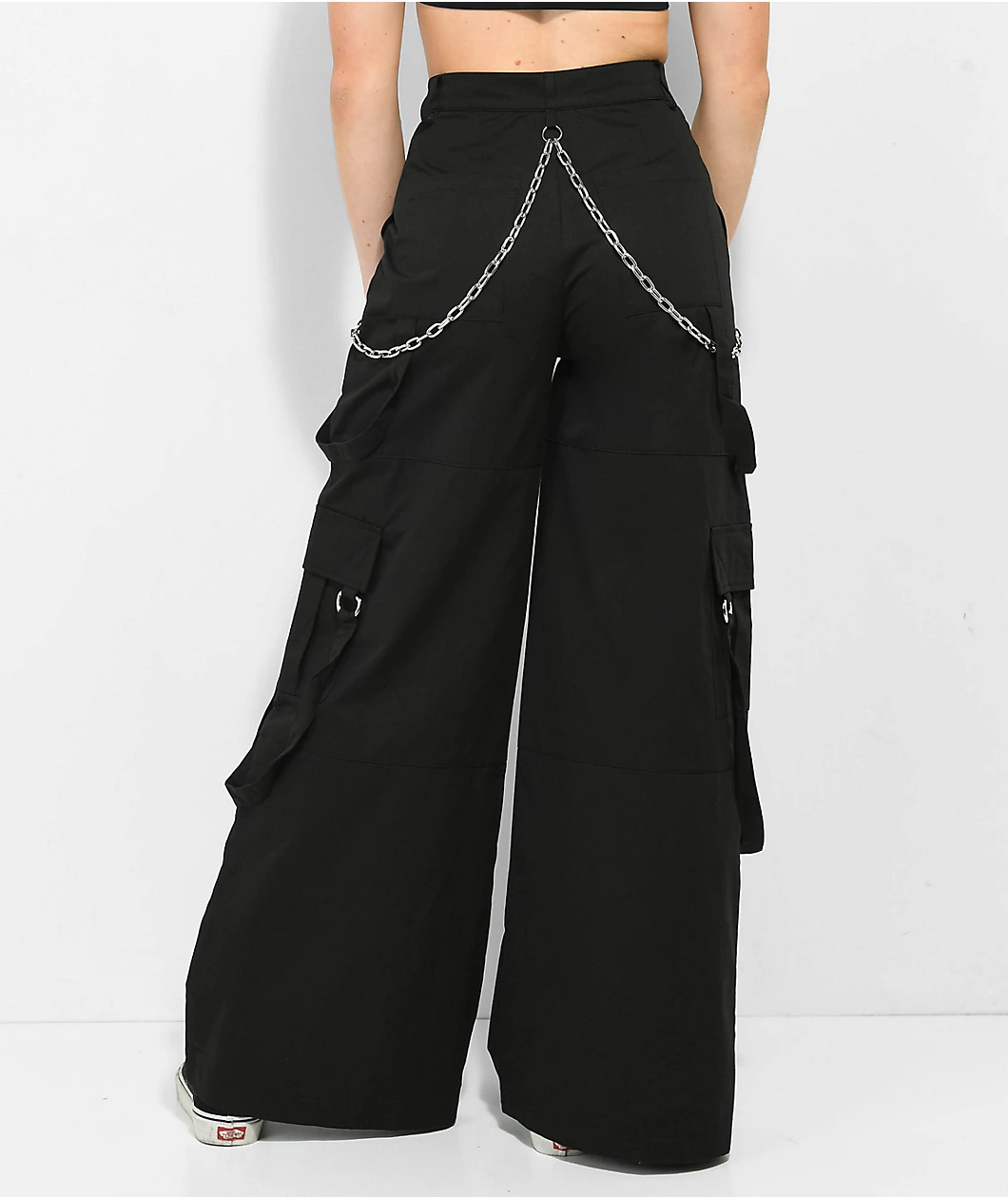 The black Rage pants by Ragged Priest feature a look inspired by goth Tripp pants of the 90s with silver loops and chains, including faux-suspenders, and cargo pockets throughout. For a secure fit, these loose pants have hook-and-bar closure with full zip as well as belt loops for further adjustment if necessary.