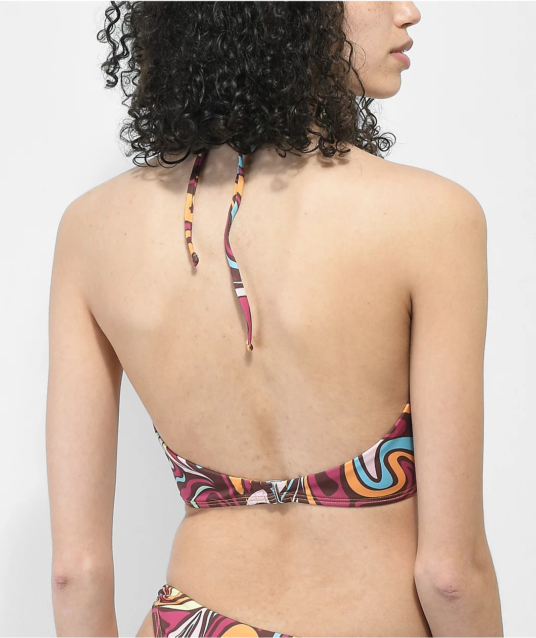 The Rue Sunsets bralette bikini top has swirling, sublimated all-over print in affogato brown, ginger yellow, purple, orange, and more. This Sunsets bikini has a bandeau style silhouette, with an around-the-neck halter strap. Lightweight, quick-drying, and fully-lined, this Sunsets swimsuit is sure to be a favorite.