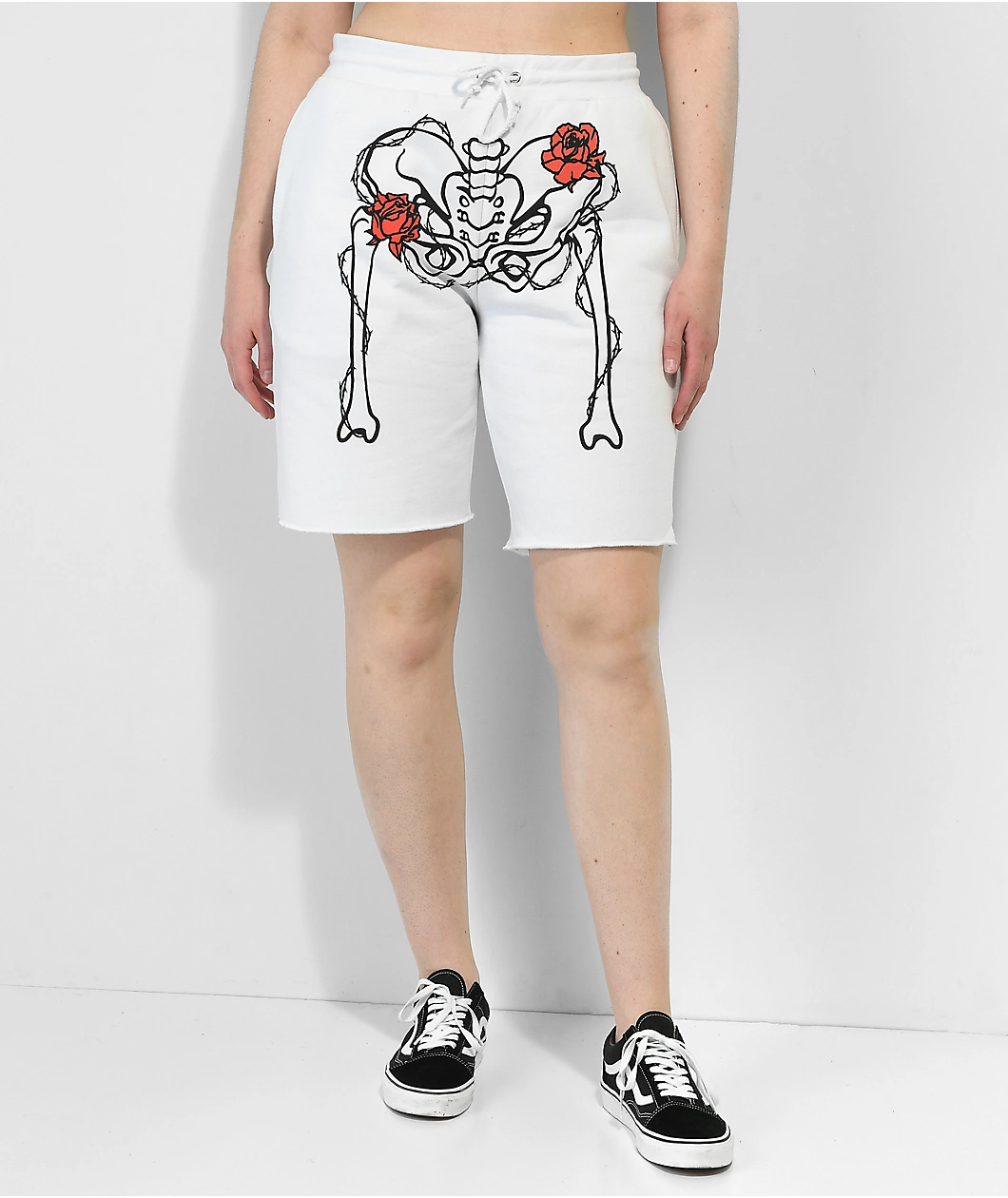 The Skeleton SWIXXZ sweat shorts come in a white colorway with a screen-printed graphic on the front of skeletal hipbone and femurs adorned with red roses and barbed wire. These shorts feature a drawstring- adjustable elastic waist for the perfect fit every time and a raw bottom hem for a relaxed look.
