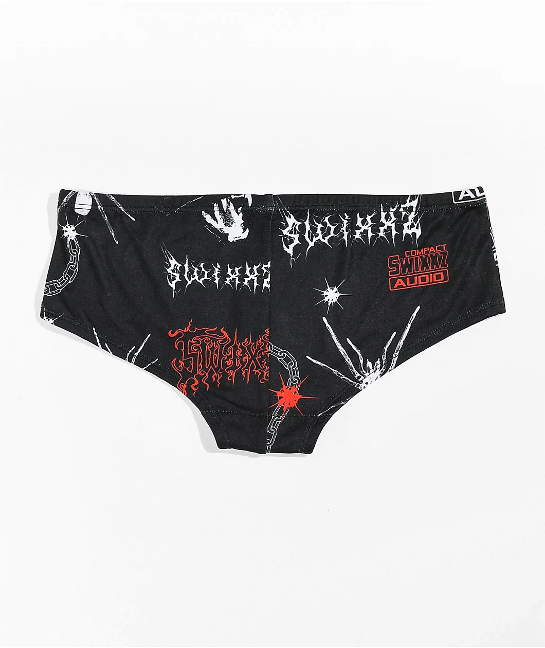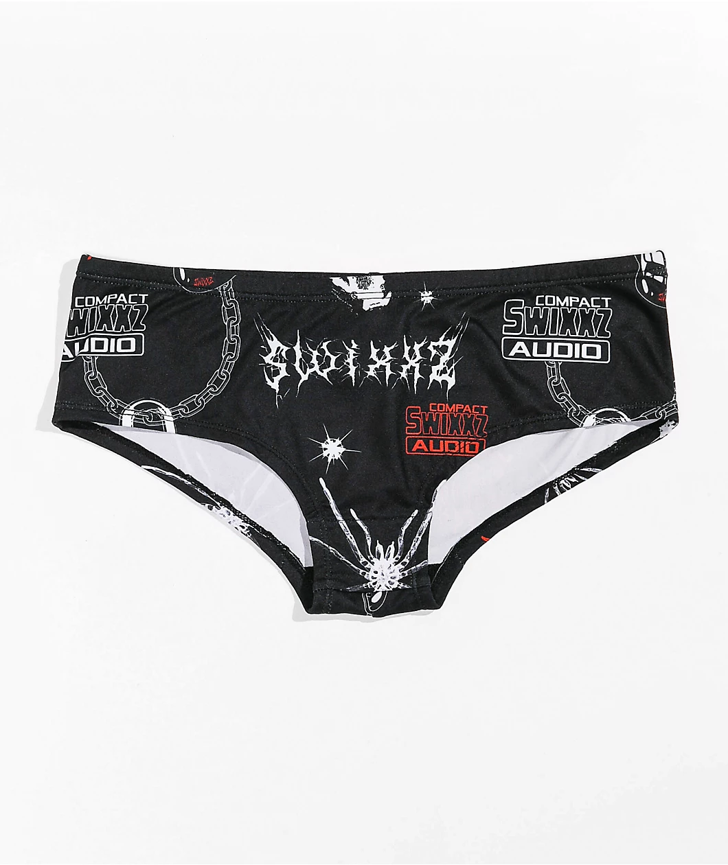 Throw some edgy vibes into your underwear collection with the SWIXXZ Trouble All Over Print boyshort underwear. This underwear features a black colorway with locks, spiders and chains printed throughout for a pop of style, while the soft internal liner is super comfortable as well.