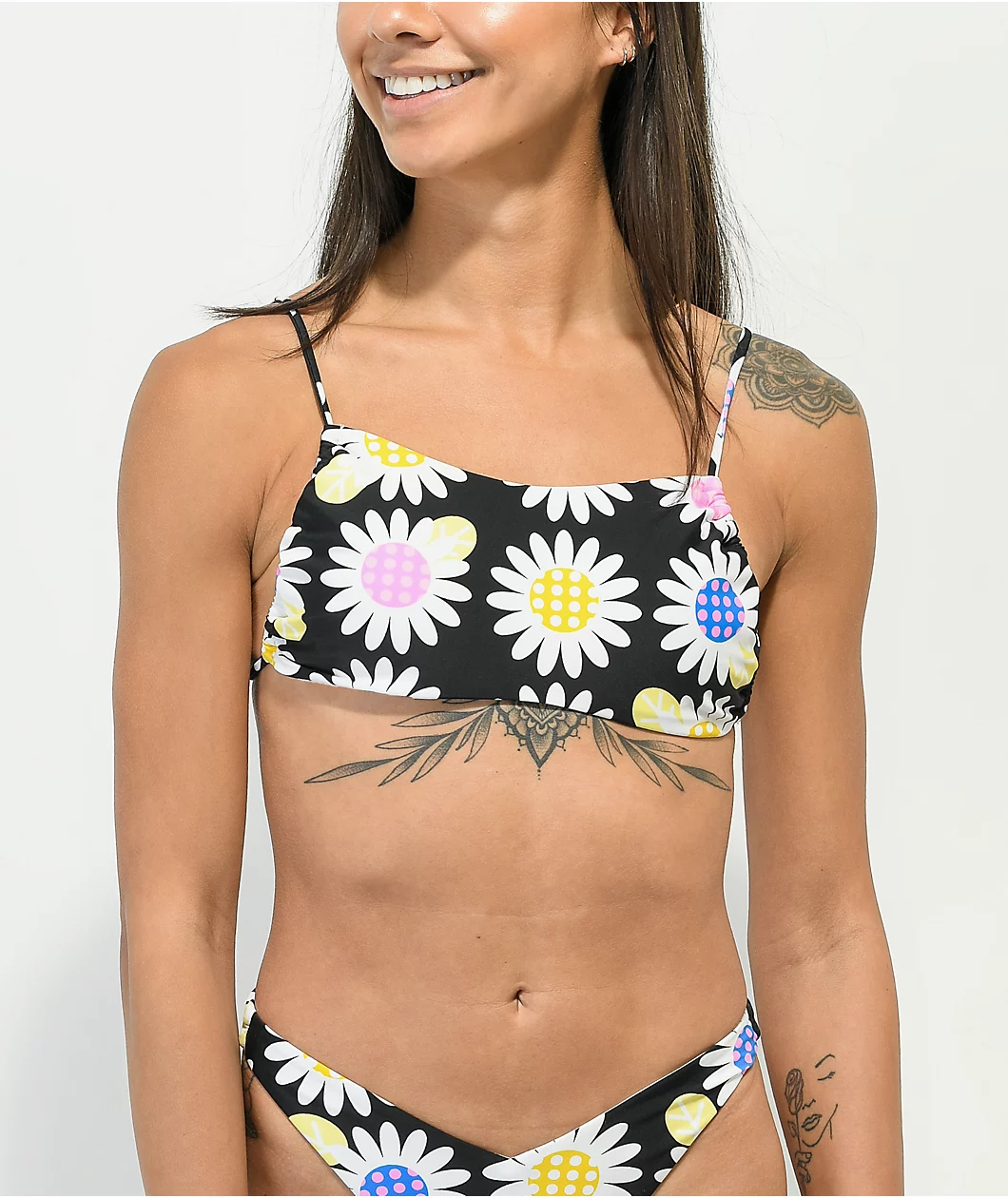 The Lizzie Daisy Trillium bikini top has a classic bandeau style in a black colorway adorned with sublimated graphics of daisies throughout, providing moderate coverage for any adventure.