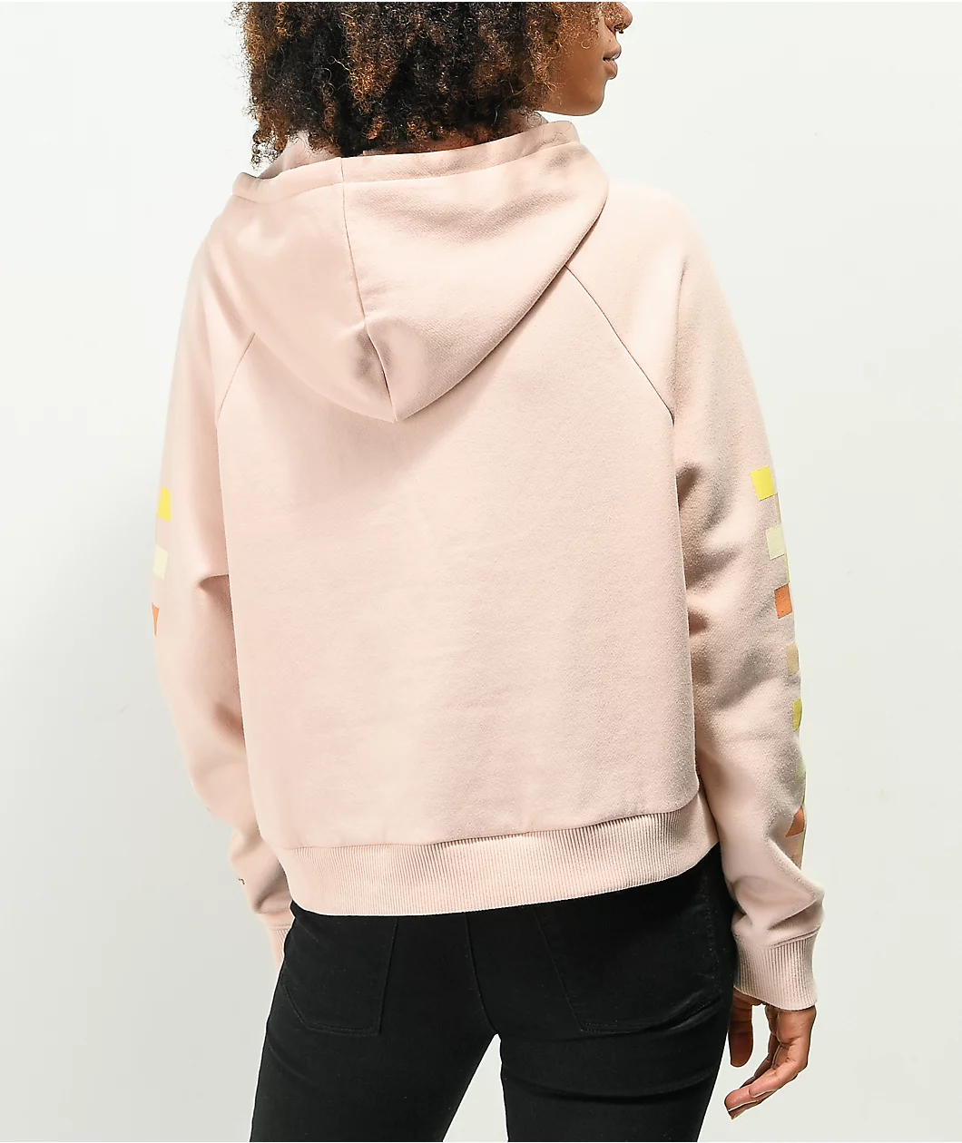 The Angie Marino peach crop hoodie from Vans features a striking design that was made in collaboration with the BMX rider herself, with a floral embroidery at the chest and Vans script underneath for some eye-catching branding. This jacket is made of a soft, cotton-poly blend and has white, tan, yellow, and orange checkered detailing adorns each sleeve, finishing off the look with some tonal highlights.