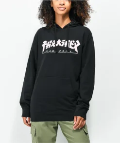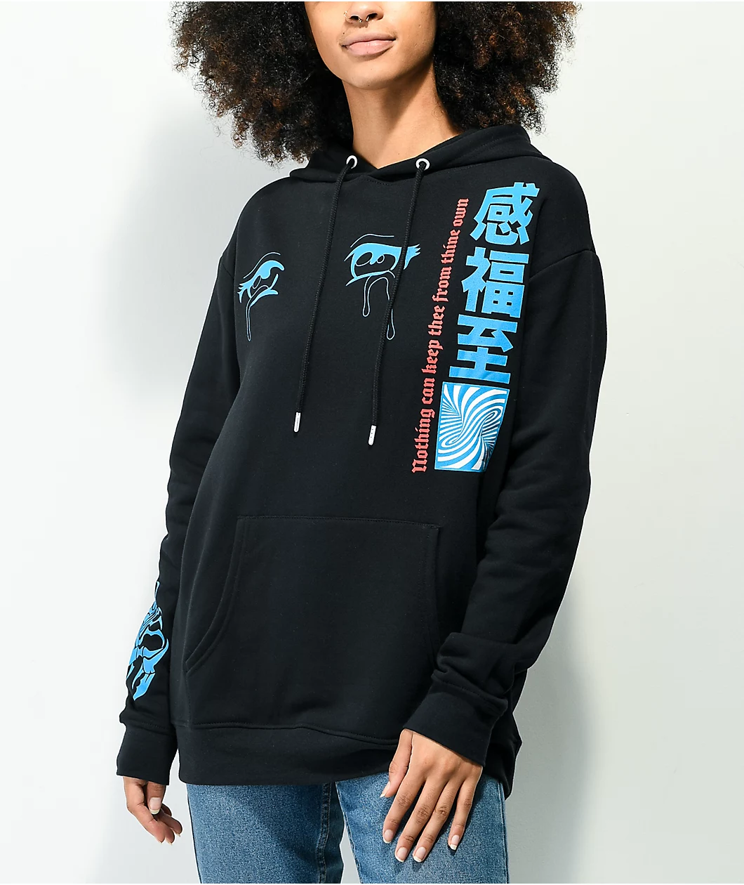Inject some anime into your hooded pullover game with the Vitriol Jamison Anime black hoodie! This super-soft, relaxed sweatshirt comes in a black colorway and is equipped with the classic adjustable drawstring hood and kangaroo pouch pocket. On the chest are screen-printed graphics of eyes and Chinese characters, while the right sleeve has a scorpion skeleton, and the back bears a graphic of an anime woman, more Chinese characters, and the word “Bliss.”