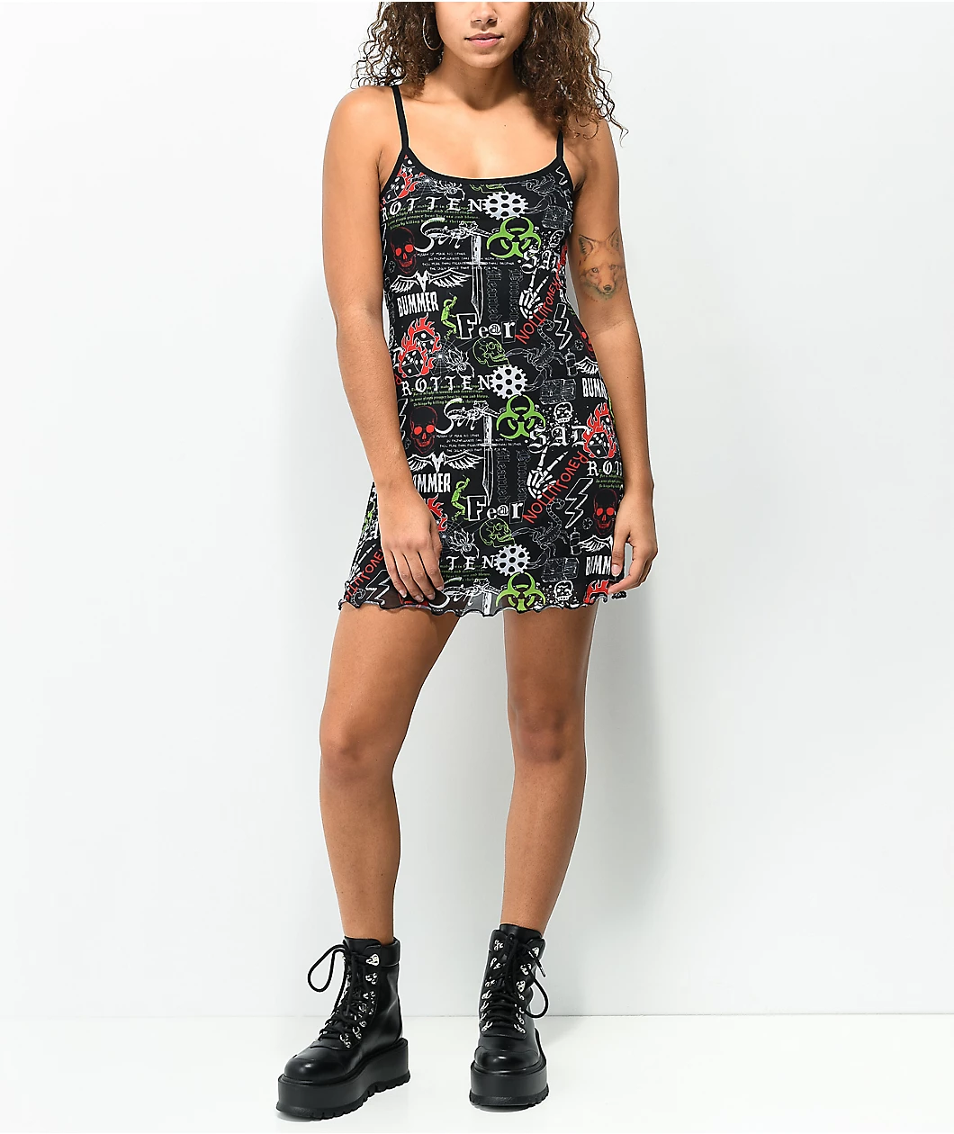 Scare the neighbors in the Vitriol Lyra black mesh tank top dress! This sinister dress has a mesh construction, giving it loads of breathability and a unique look, while the elastic straps offer comfort and stability. The entire dress is sublimated with a collage of disturbing, ghoulish graphics and texts, for example: toxic signs, spider webs, skulls, and words like “Rotten” and “Fear.” Now you can adorn yourself in Halloween-inspired garb regardless of season.