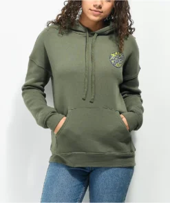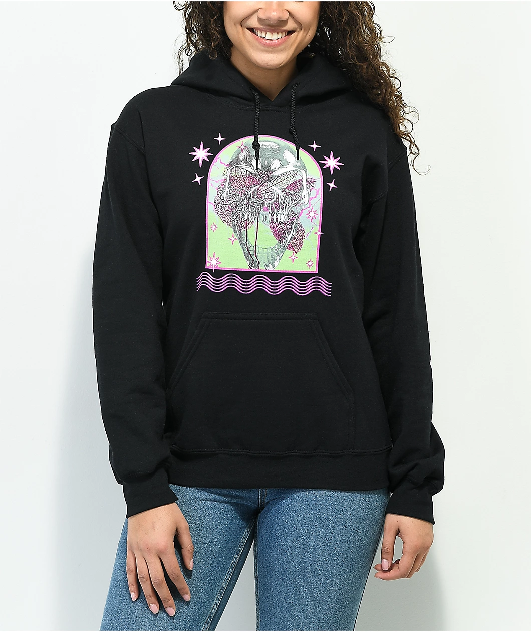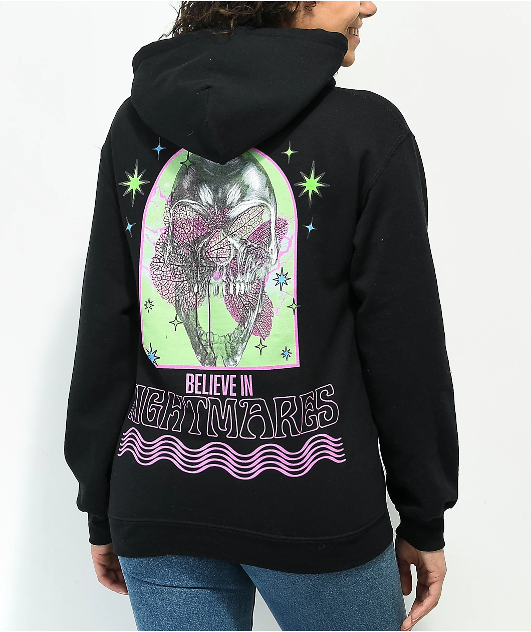 The Nightmares Vitriol hoodie comes in a black colorway with a screen-printed graphic on the front of a skull and butterfly layered over one another and on the back of the same image above script reading, “Believe in nightmares.” This jacket has a classic hoodie construction with a drawstring-adjustable hood, a kangaroo pouch pocket, and ribbed hems throughout.