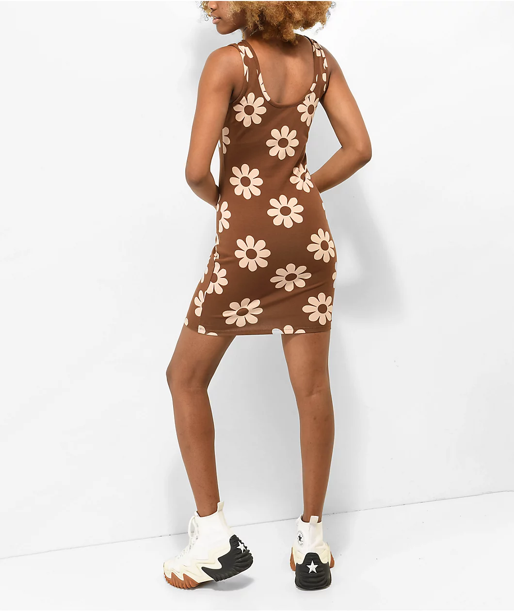 From Your Highness, the Hazy Daisy tank dress boasts a brown and beige floral pattern throughout, adding a retro look. Made from a stretchy cotton blend, the slim silhouette is simply branded with a rubber brand patch on the chest.